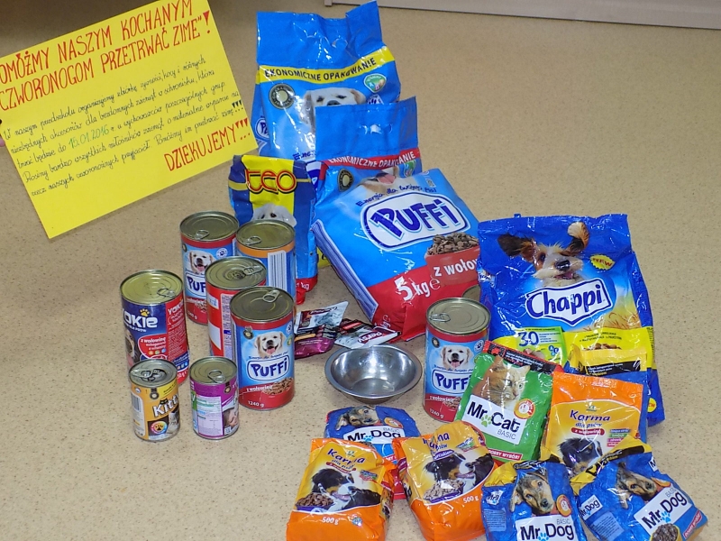Pomagamy również przetrwać zimę zwierzętom mieszkającym w schronisku. Zbieramy karmę dla psów i kotów. Przydadzą się również inne artykuły – koce, poduszki itp.