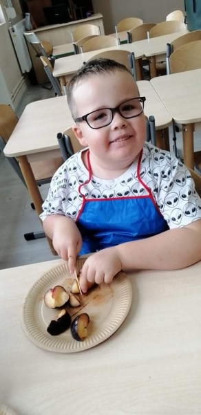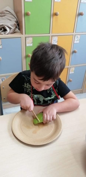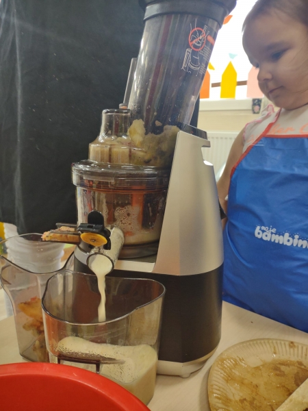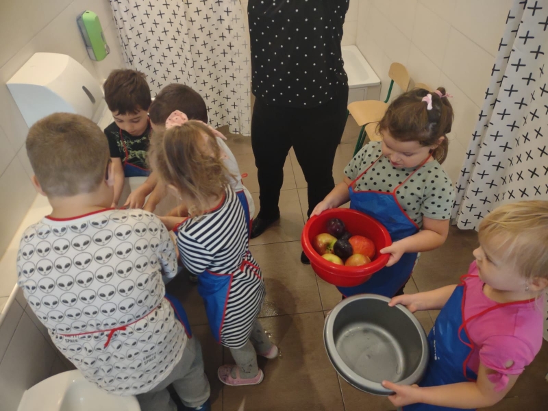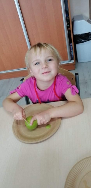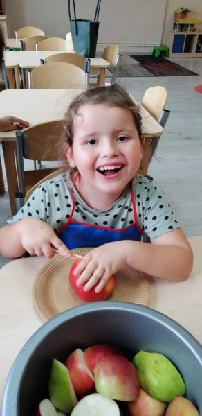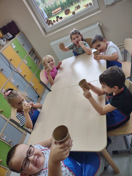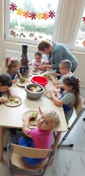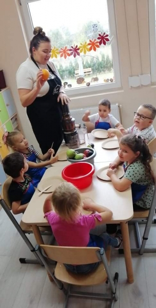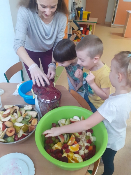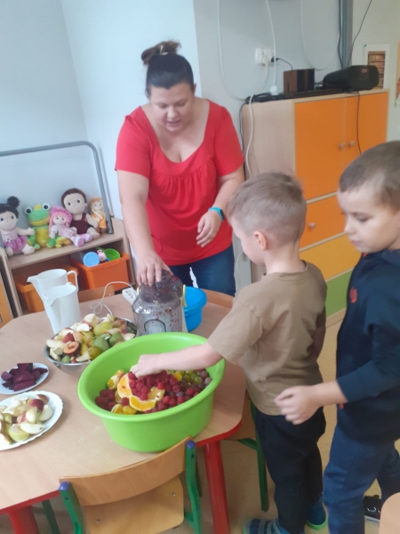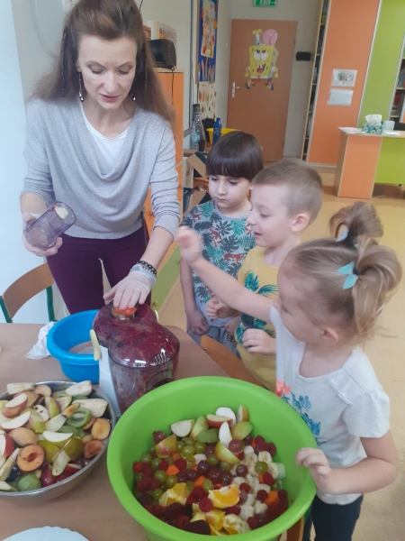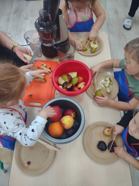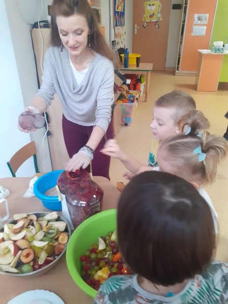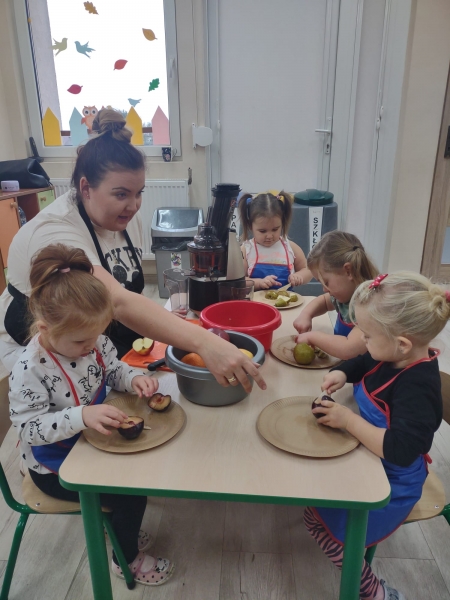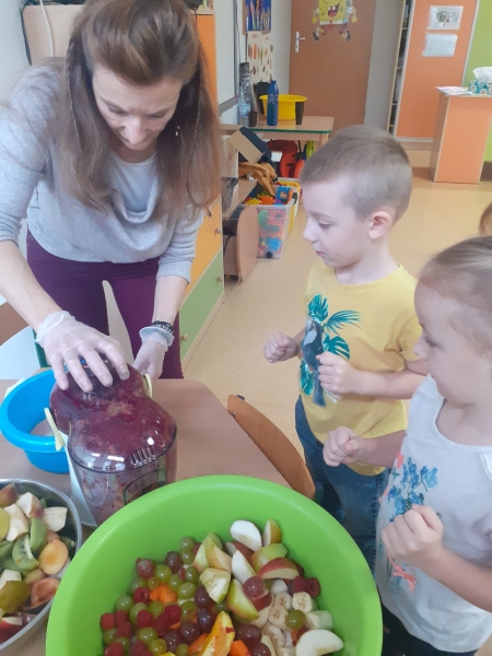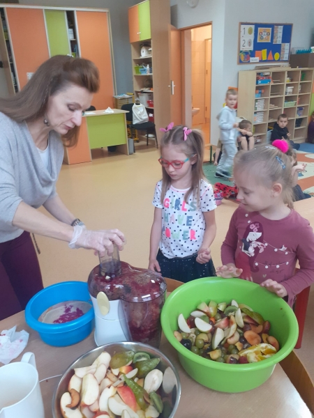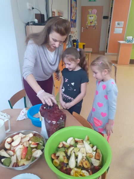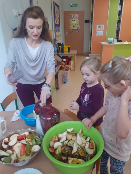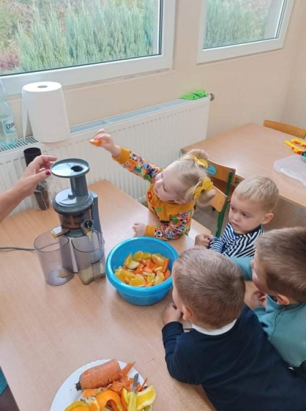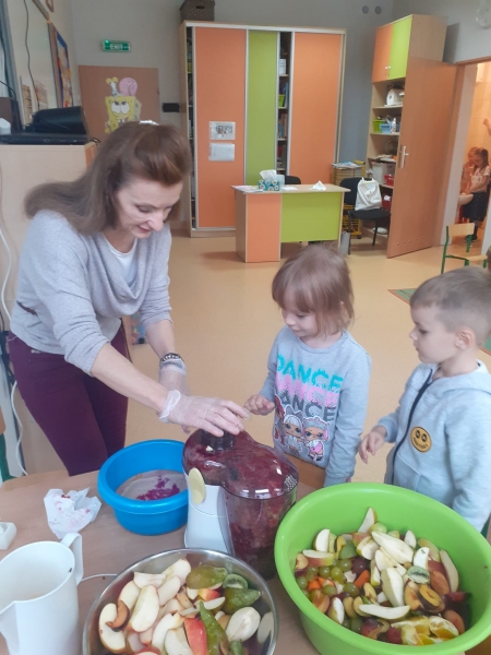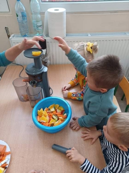 Dzieci wraz z Paniami zrobiły pyszny sok owocowo-warzywny. Dużo frajdy sprawiło dzieciom przygotowanie owoców i warzyw do soku. Mamy nadzieję, że picie soków wzmocni naszą odporność. 🙂