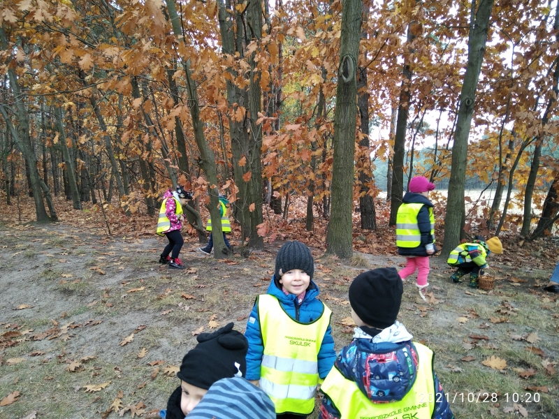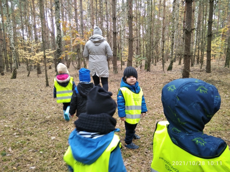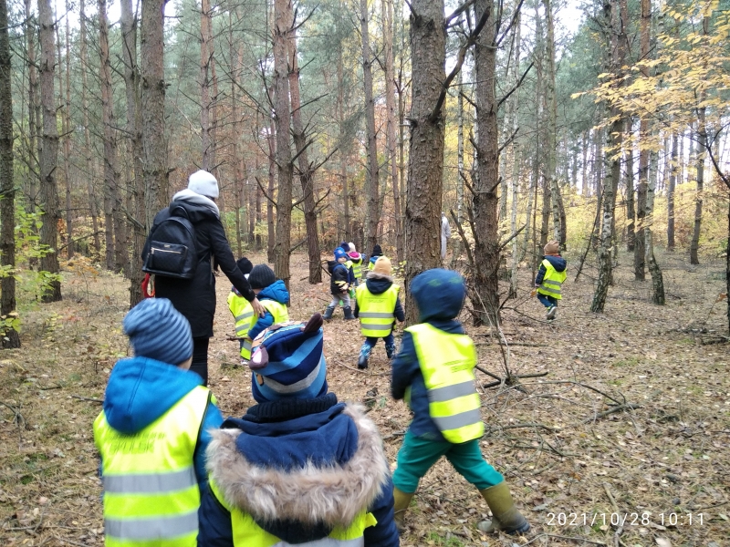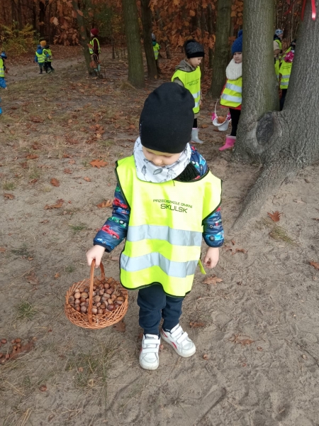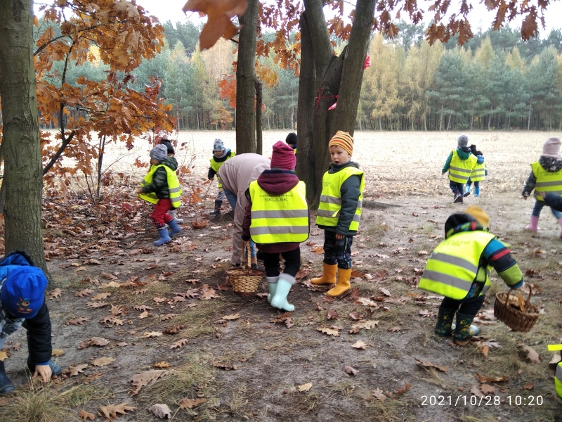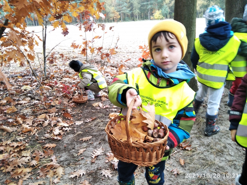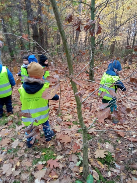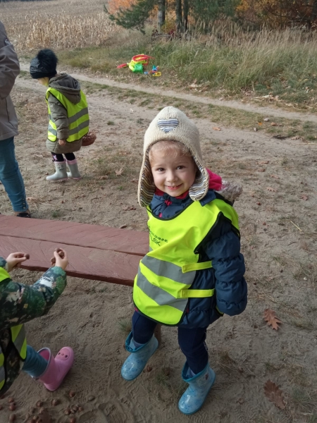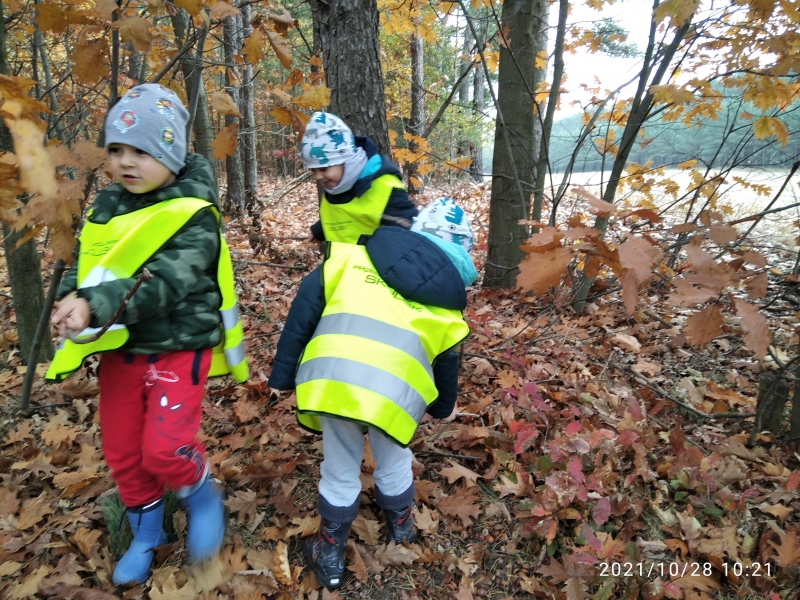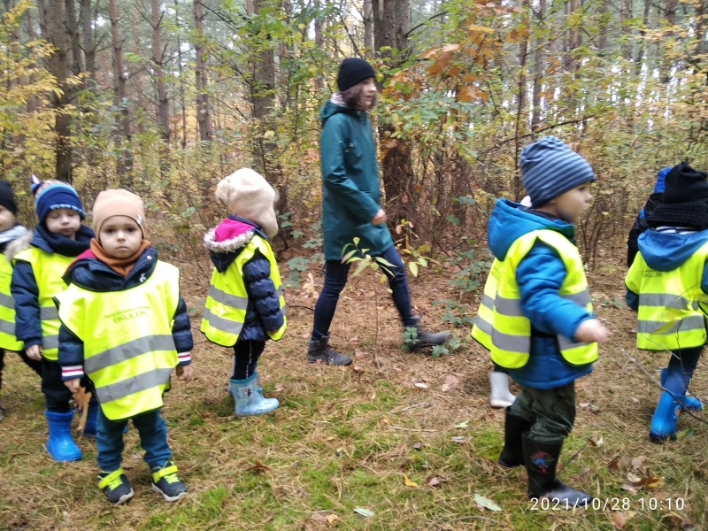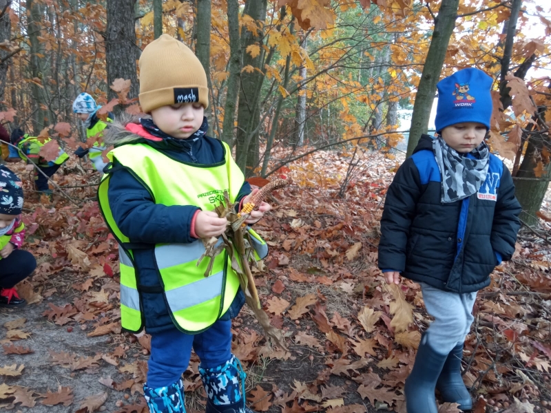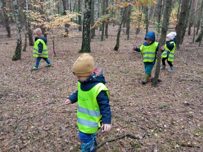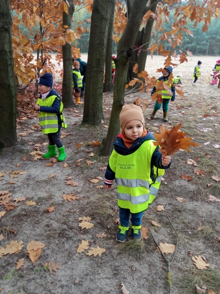 28 października grupy Misie, Pszczółki oraz Motylki wybrały się na spacer do jesiennym lesie. To była wspaniała okazja do obserwacji zmian zachodzących w przyrodzie jesienią. Kolorowe drzewa, pachnące grzyby, kasztany i żołędzie znalezione pod dębami zachwyciły wszystkich. Wspaniała pogoda sprawiła, że był to bardzo miły czas spędzony na łonie natury.