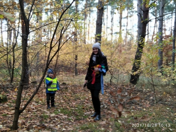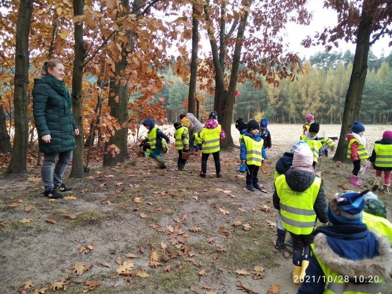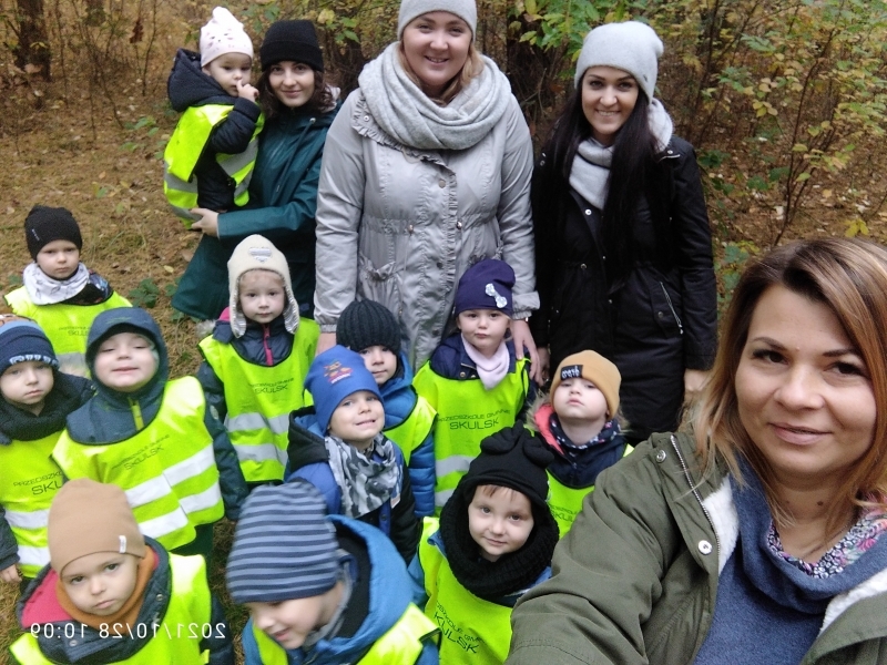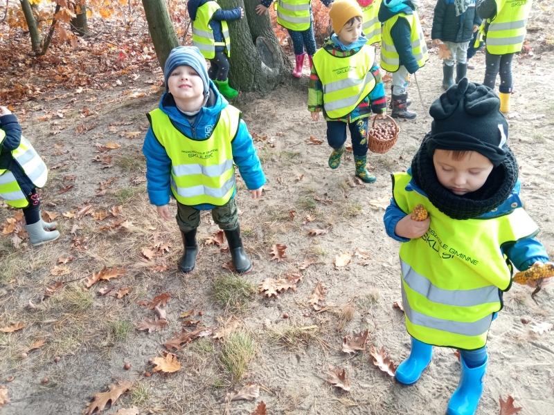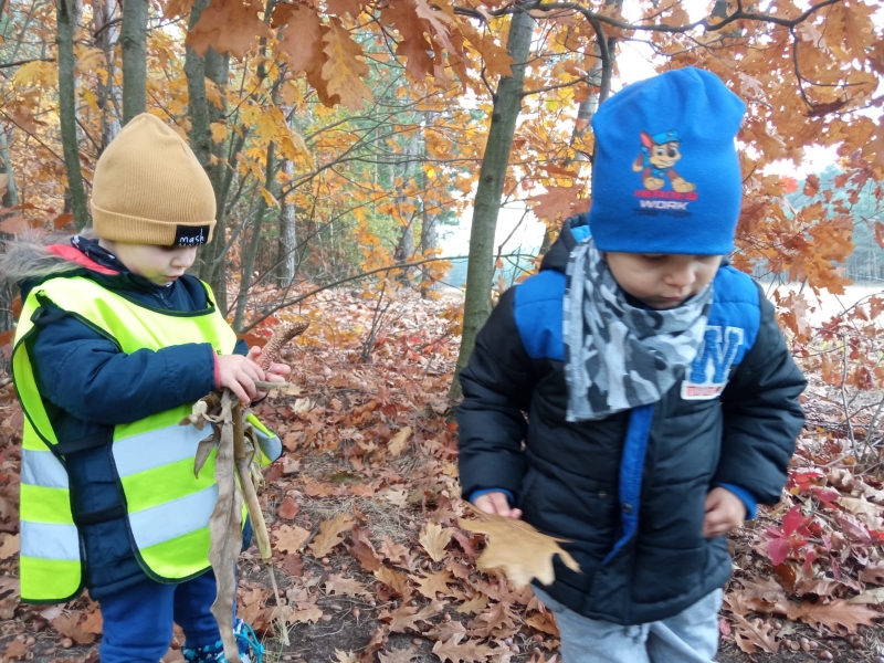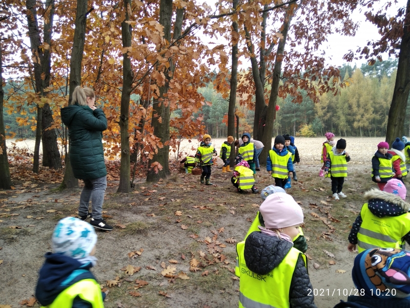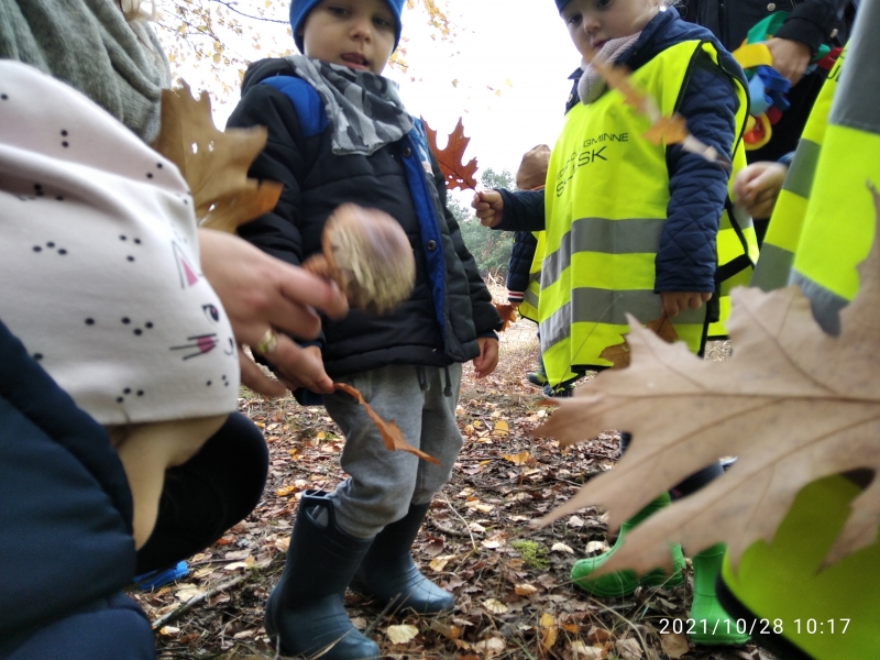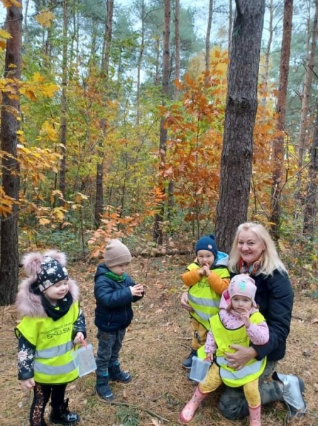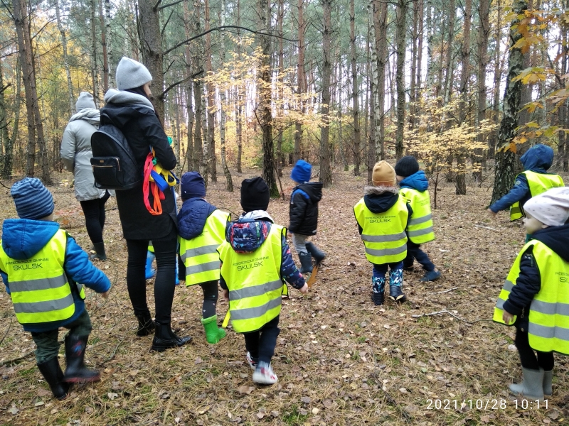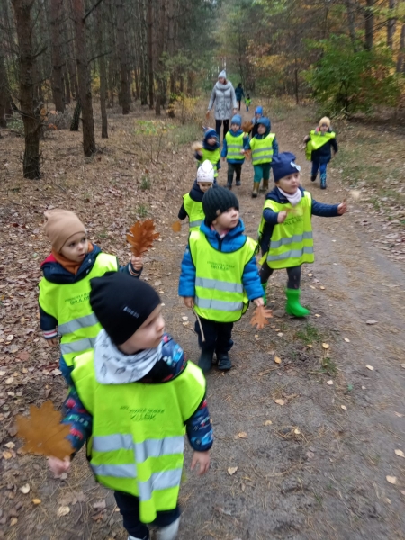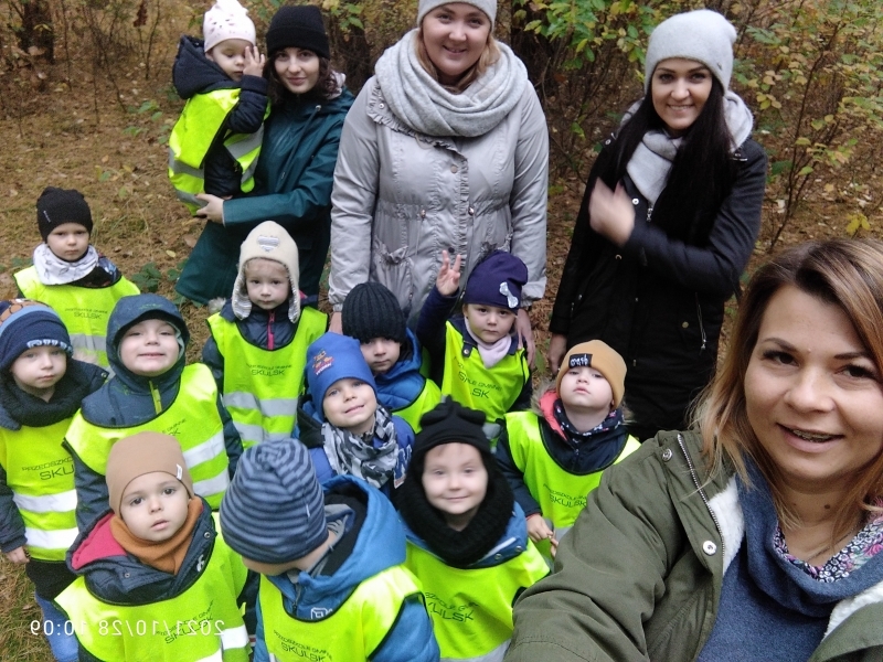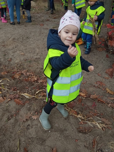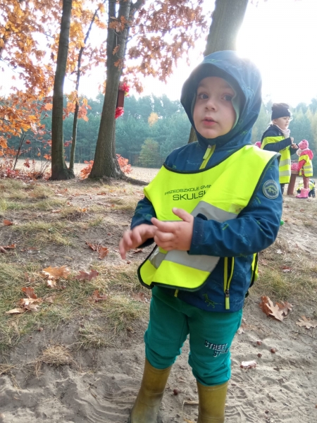 28 października grupy Misie, Pszczółki oraz Motylki wybrały się na spacer do jesiennym lesie. To była wspaniała okazja do obserwacji zmian zachodzących w przyrodzie jesienią. Kolorowe drzewa, pachnące grzyby, kasztany i żołędzie znalezione pod dębami zachwyciły wszystkich. Wspaniała pogoda sprawiła, że był to bardzo miły czas spędzony na łonie natury.