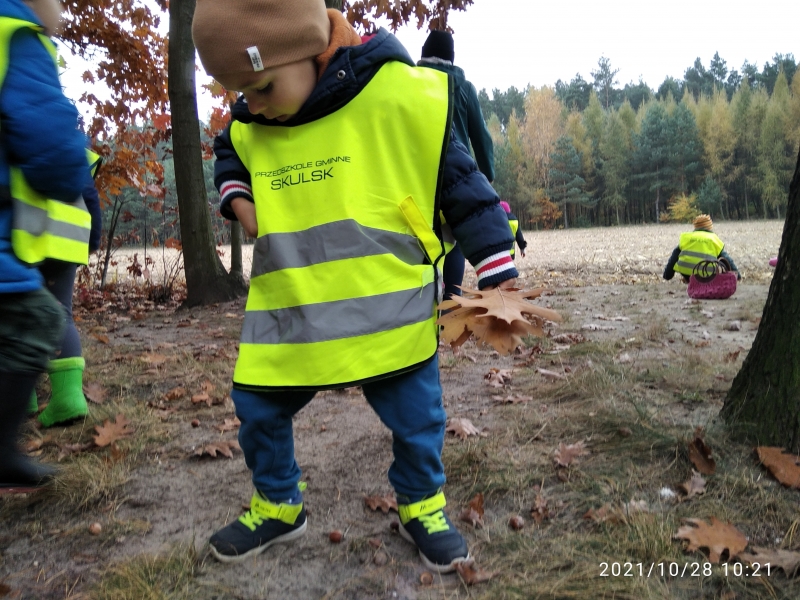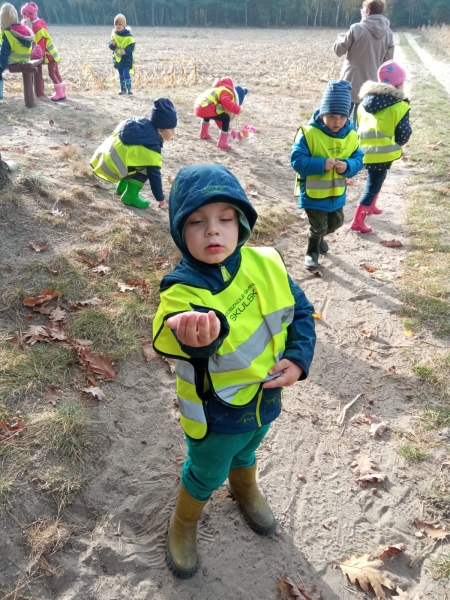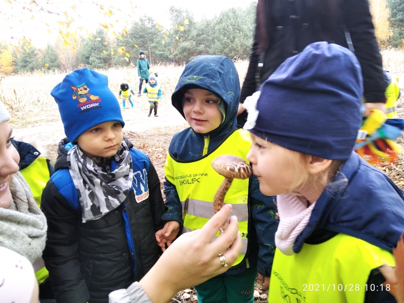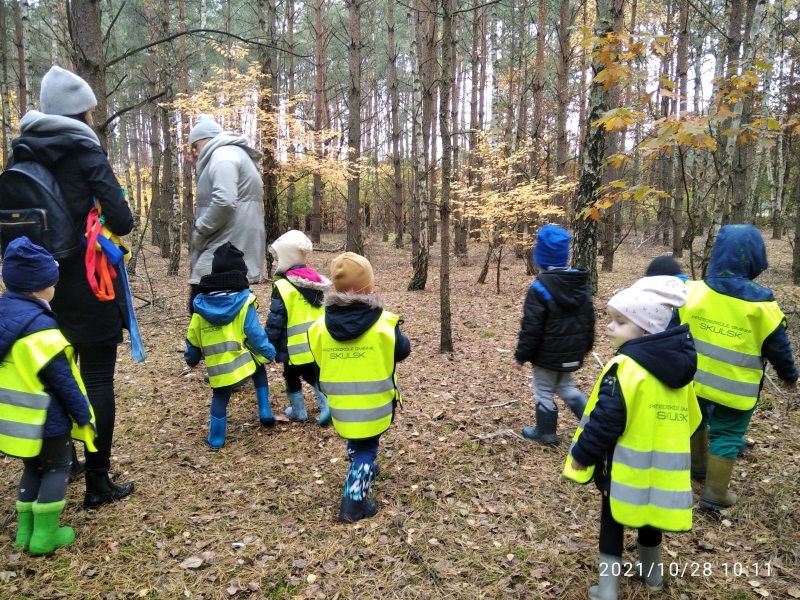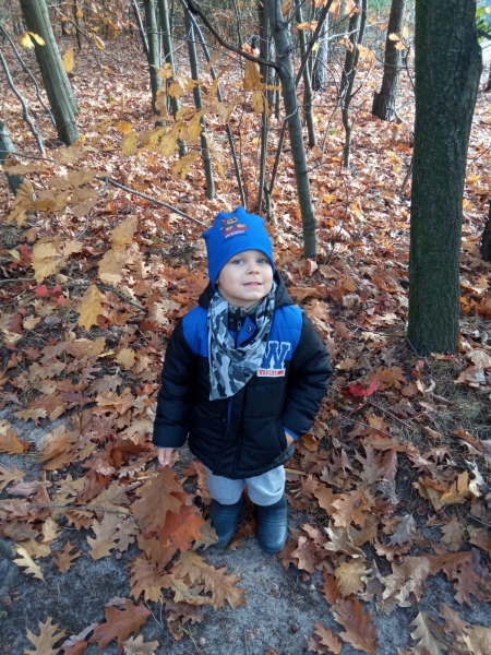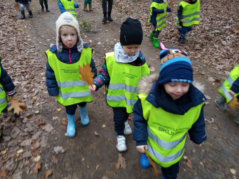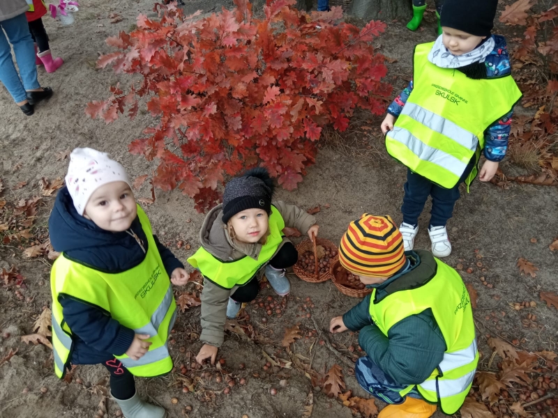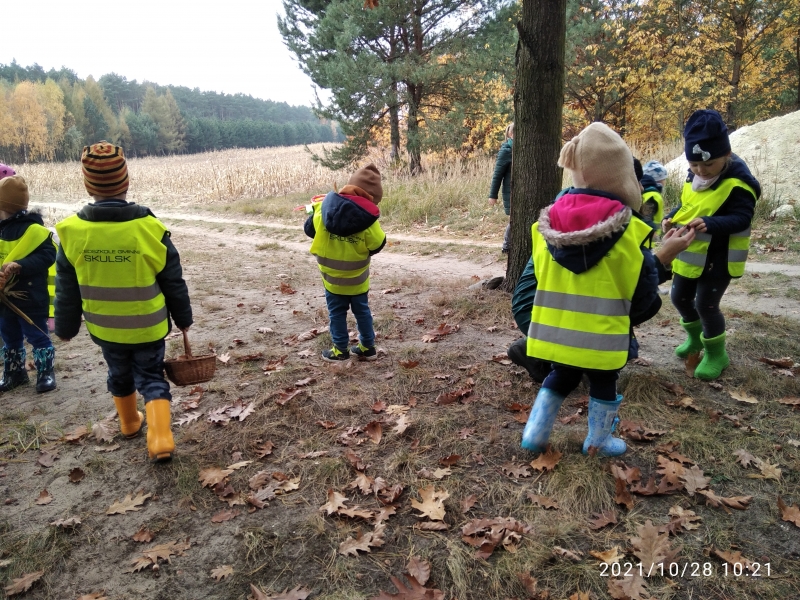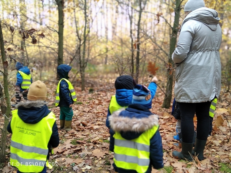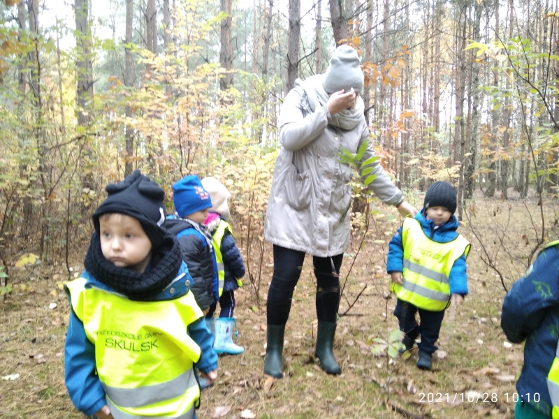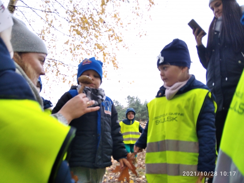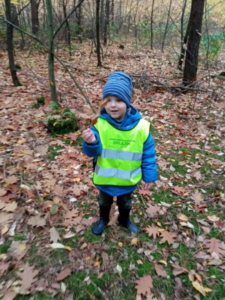 28 października grupy Misie, Pszczółki oraz Motylki wybrały się na spacer do jesiennym lesie. To była wspaniała okazja do obserwacji zmian zachodzących w przyrodzie jesienią. Kolorowe drzewa, pachnące grzyby, kasztany i żołędzie znalezione pod dębami zachwyciły wszystkich. Wspaniała pogoda sprawiła, że był to bardzo miły czas spędzony na łonie natury.