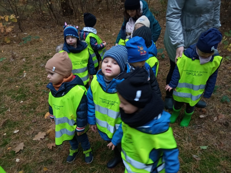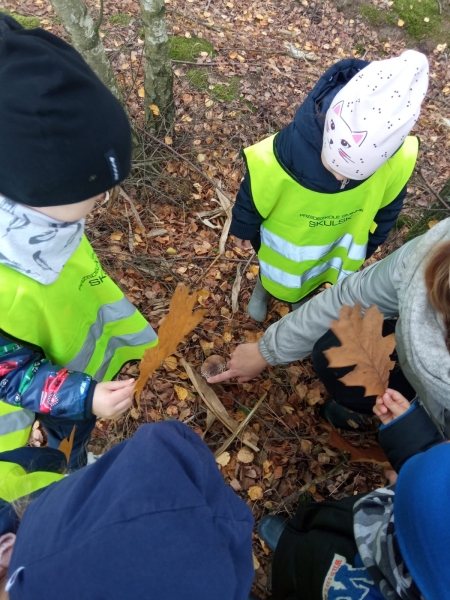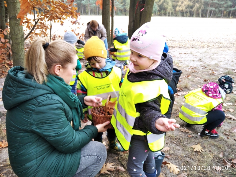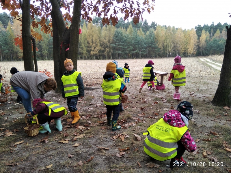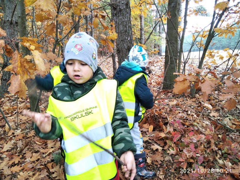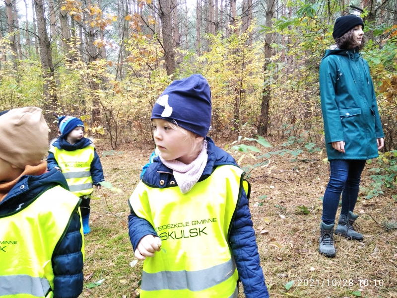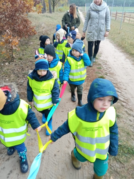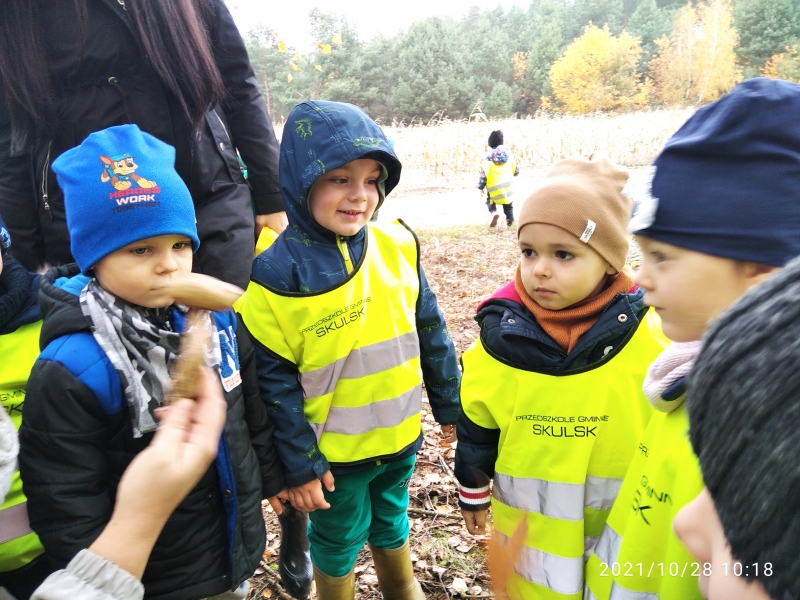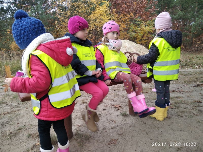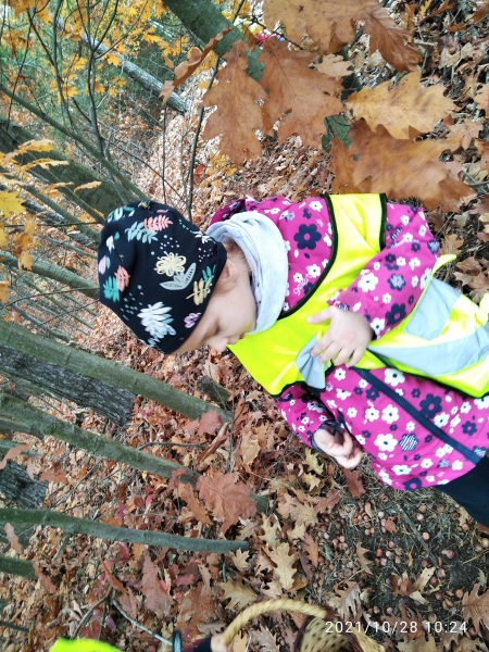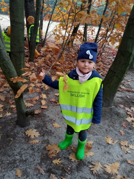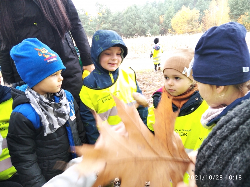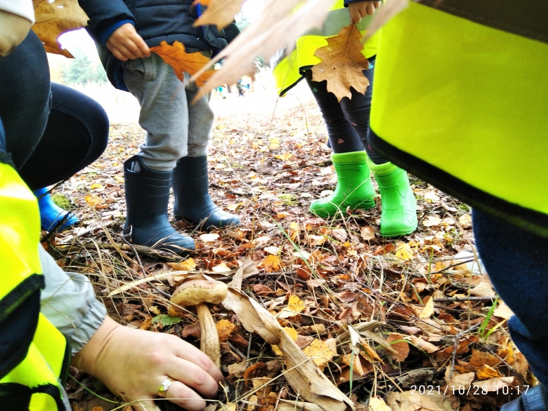 28 października grupy Misie, Pszczółki oraz Motylki wybrały się na spacer do jesiennym lesie. To była wspaniała okazja do obserwacji zmian zachodzących w przyrodzie jesienią. Kolorowe drzewa, pachnące grzyby, kasztany i żołędzie znalezione pod dębami zachwyciły wszystkich. Wspaniała pogoda sprawiła, że był to bardzo miły czas spędzony na łonie natury.