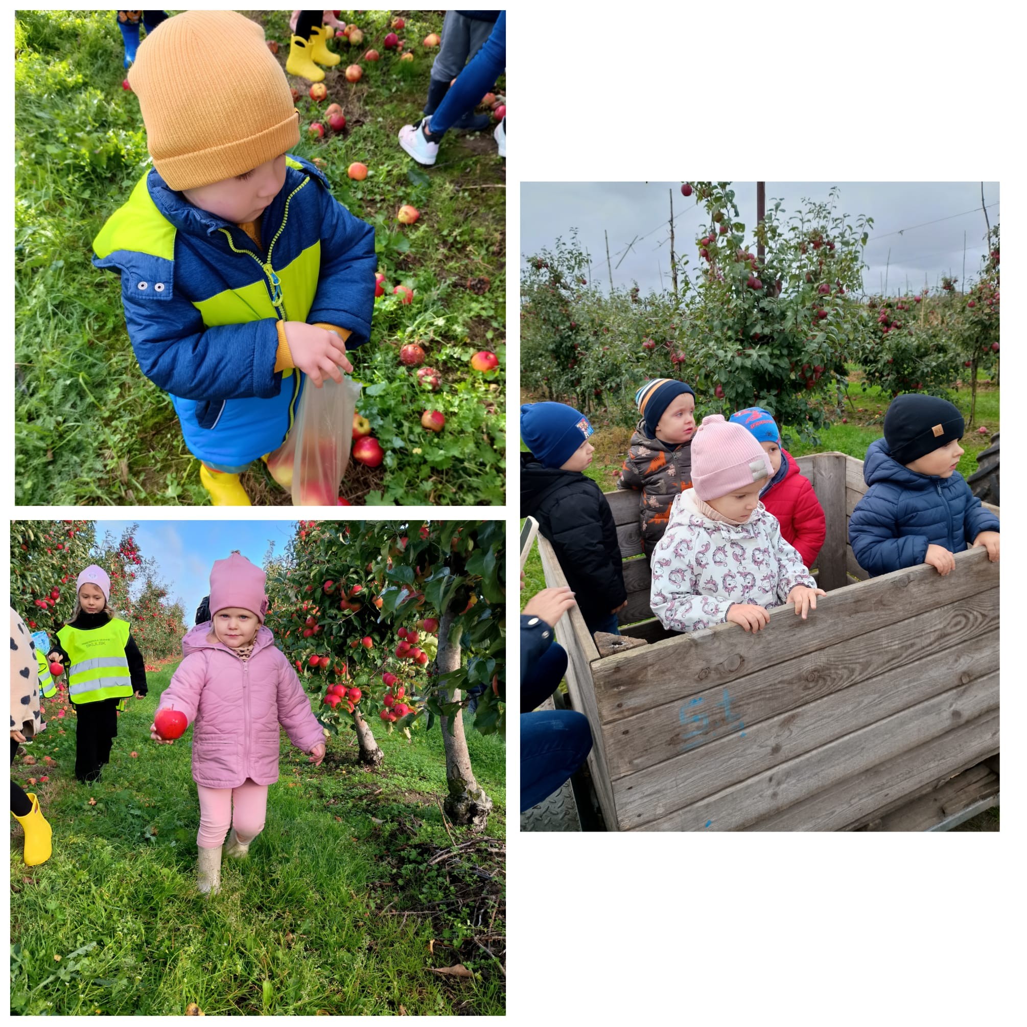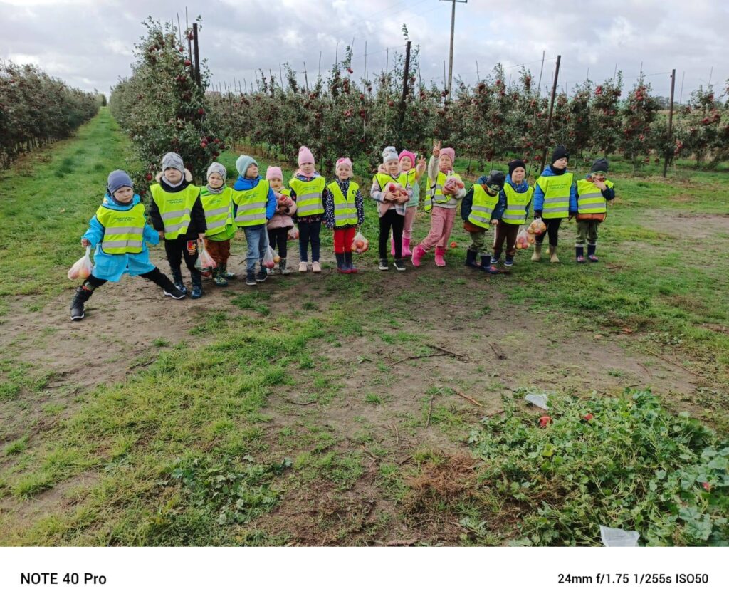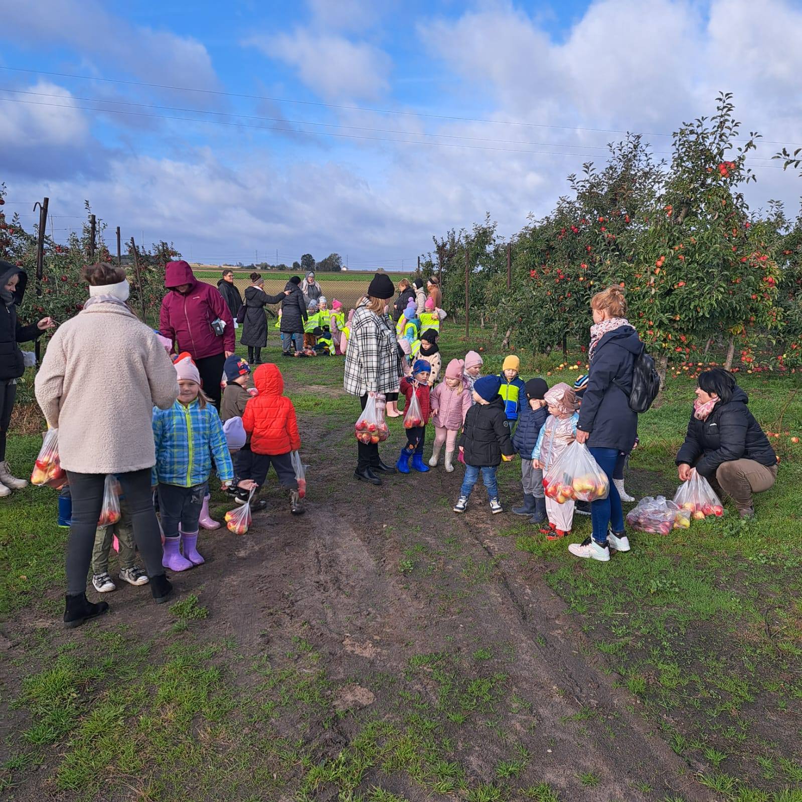 Dzieci obejrzały drzewa owocowe – przede wszystkim jabłonie – oraz wysłuchały ciekawostek na temat ich uprawy. Największą atrakcją było samodzielne zrywanie i degustowanie soczystych jabłek. Do przedszkola wróciliśmy z pełnymi torbami pachnących jabłek.