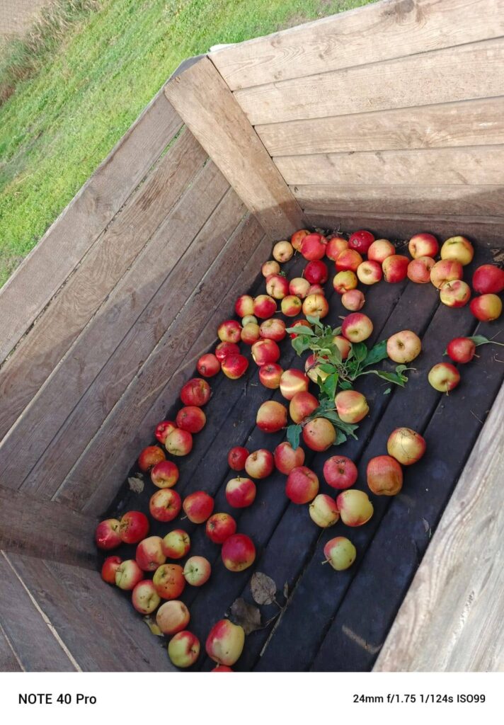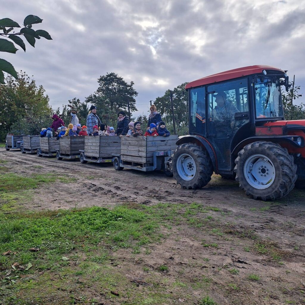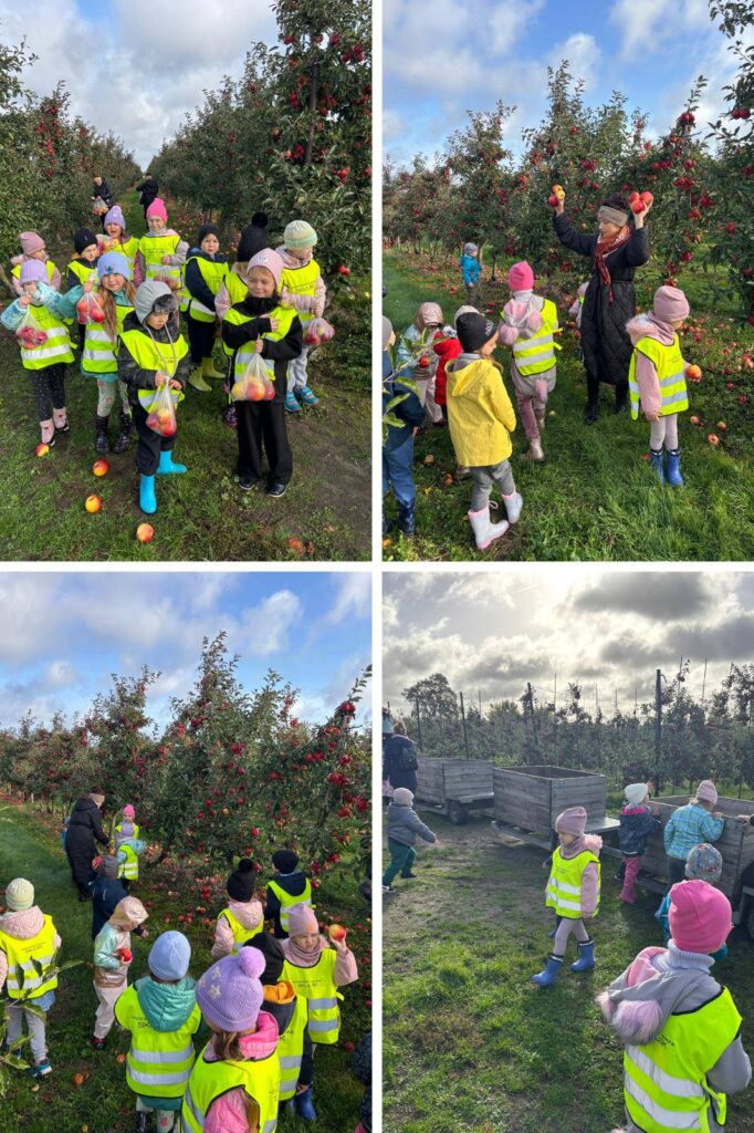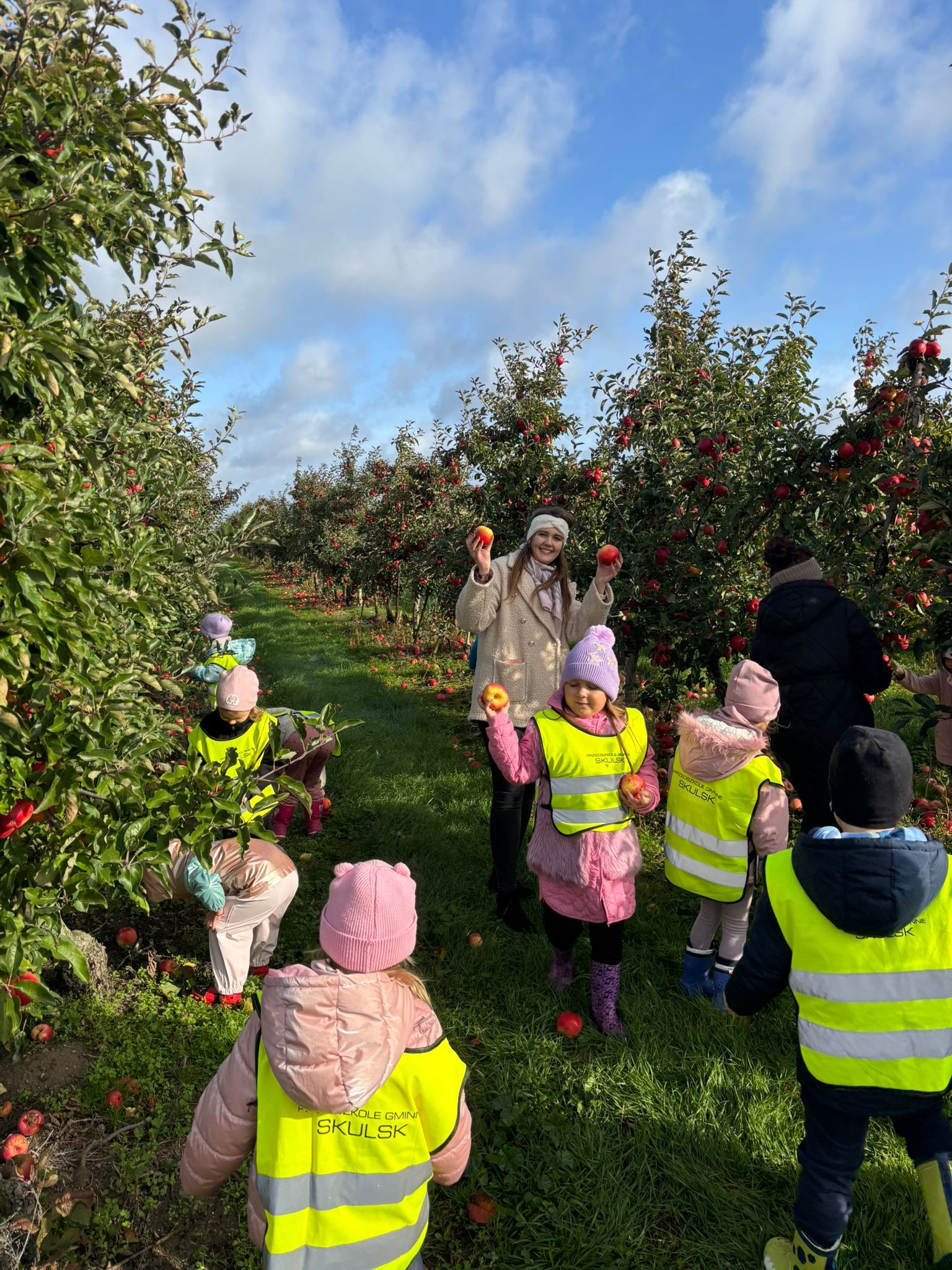 Dzieci obejrzały drzewa owocowe – przede wszystkim jabłonie – oraz wysłuchały ciekawostek na temat ich uprawy. Największą atrakcją było samodzielne zrywanie i degustowanie soczystych jabłek. Do przedszkola wróciliśmy z pełnymi torbami pachnących jabłek.