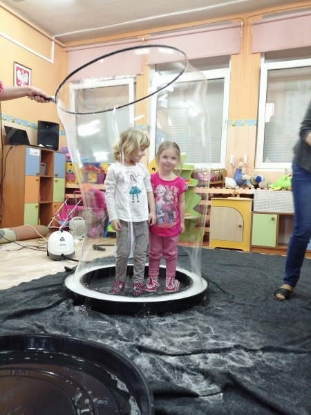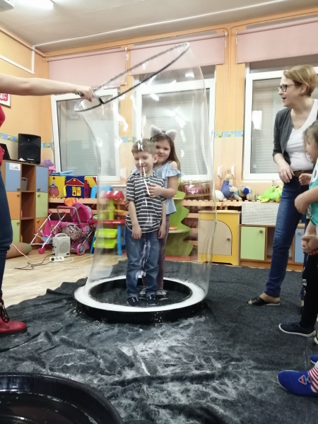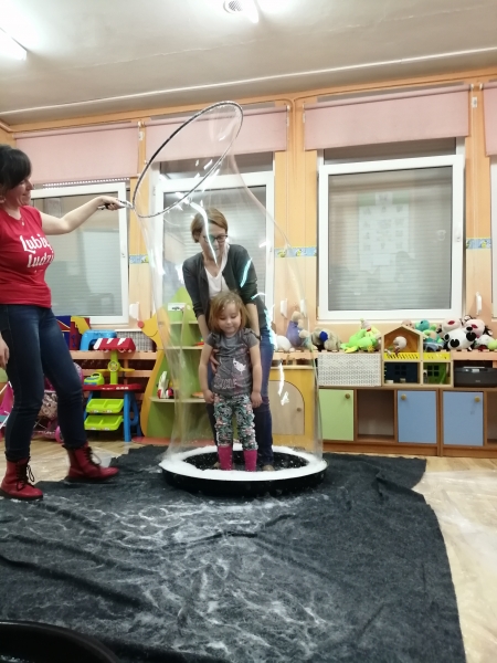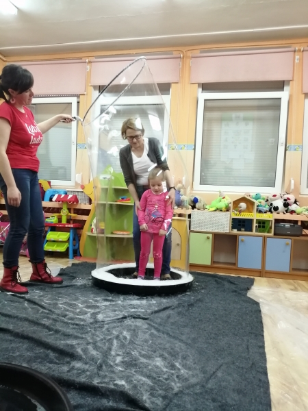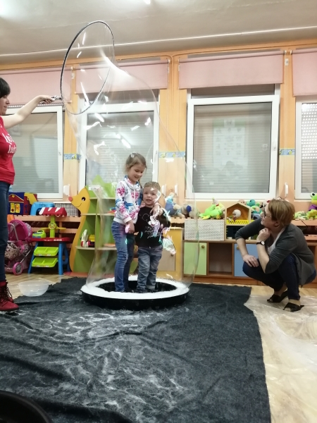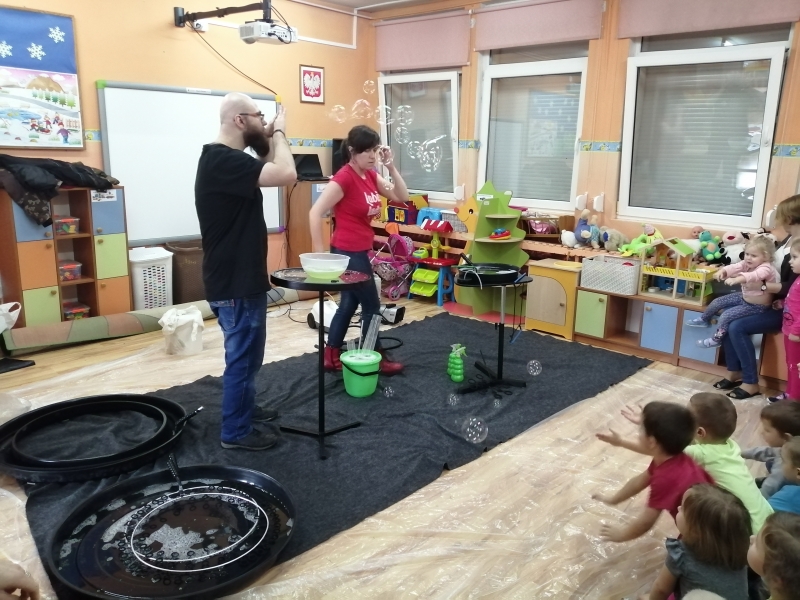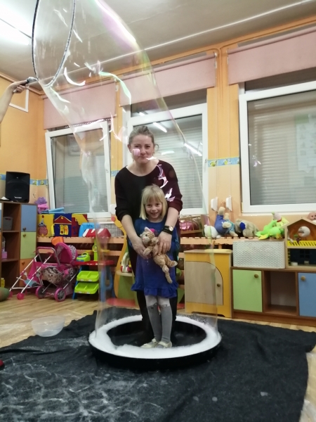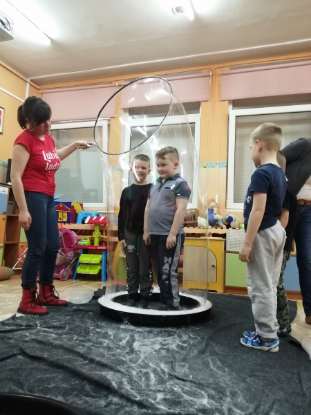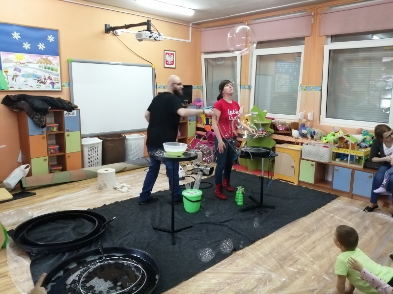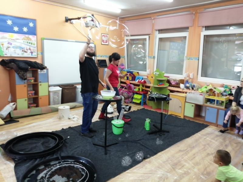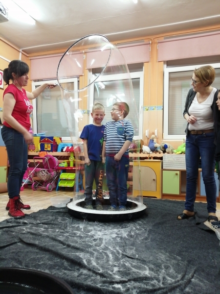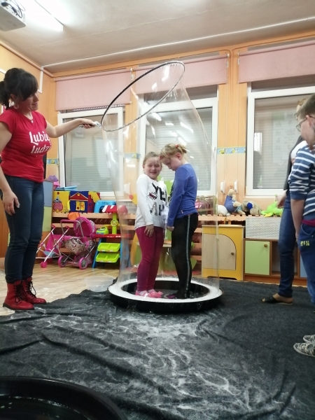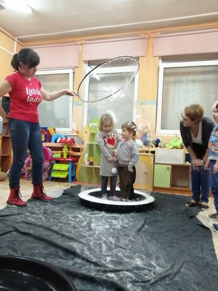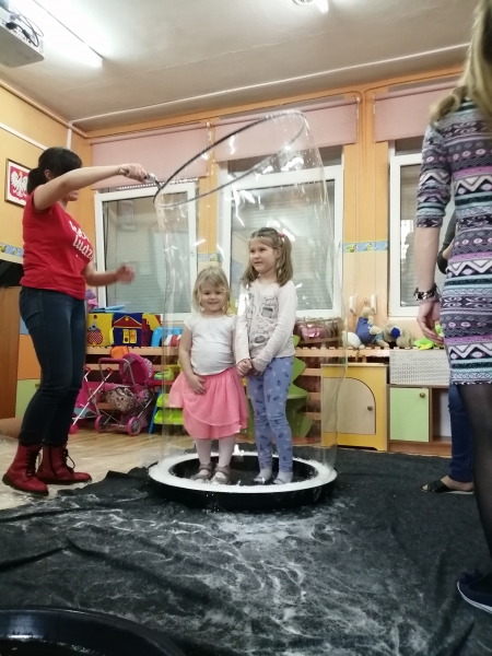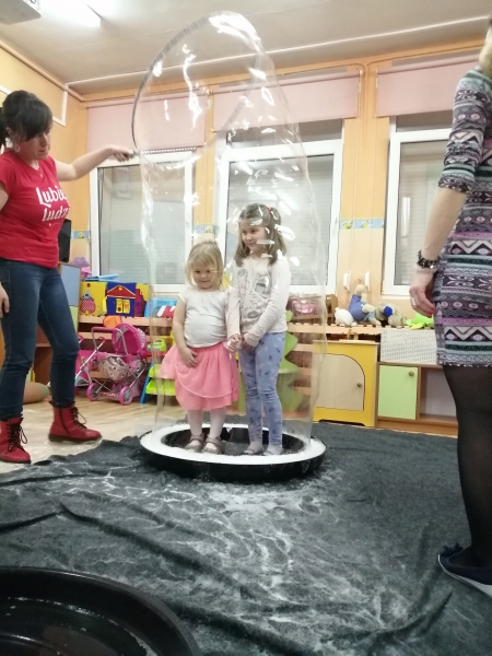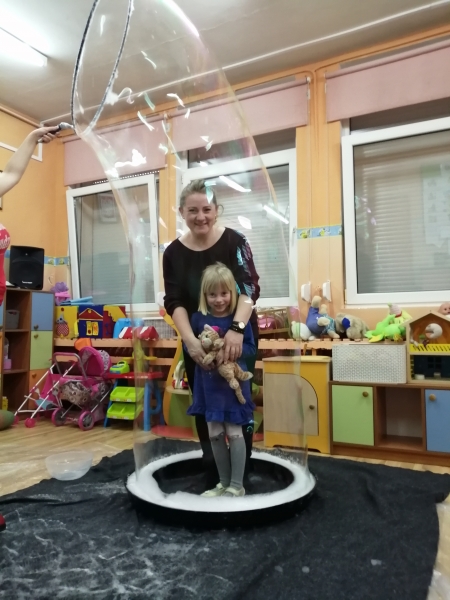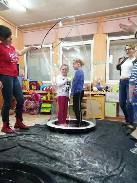 W marcu do naszego przedszkola przyjechali artyści i zaprosili nas do swojego magicznego świata baniek mydlanych. Pokaz bardzo się wszystkim podobał, dzieci podziwiały różne barwy i wielkości unoszących się dookoła baniek. Kulminacyjnym momentem było zamknięcie każdego przedszkolaka w bańce…to był wyjątkowy dzień.