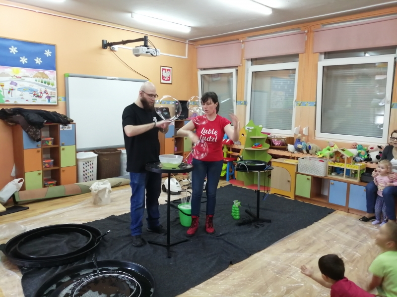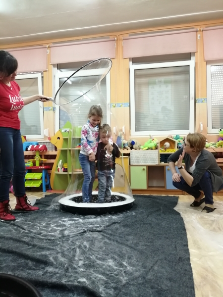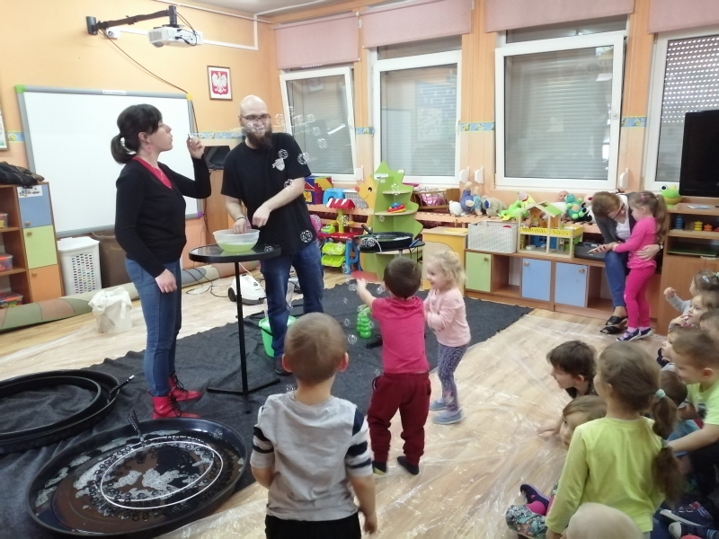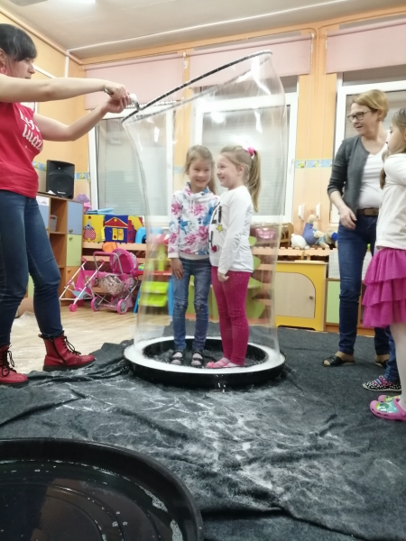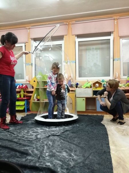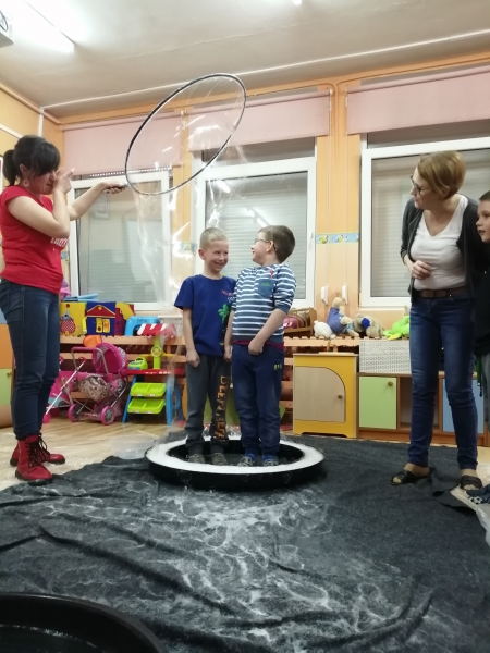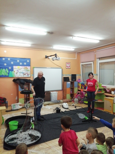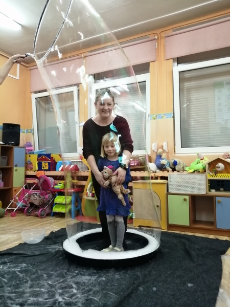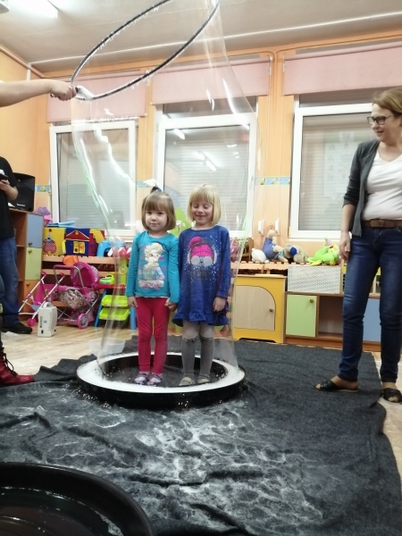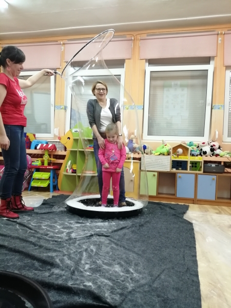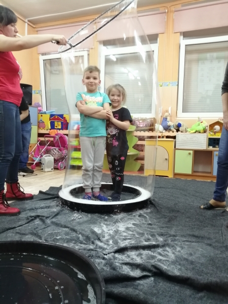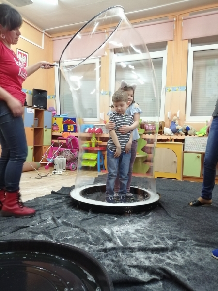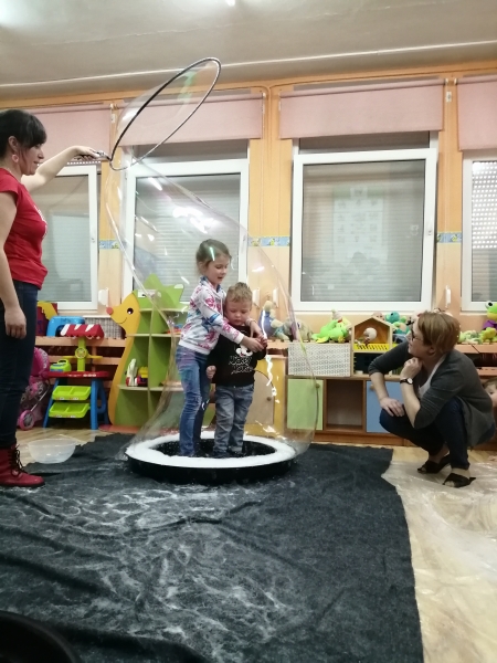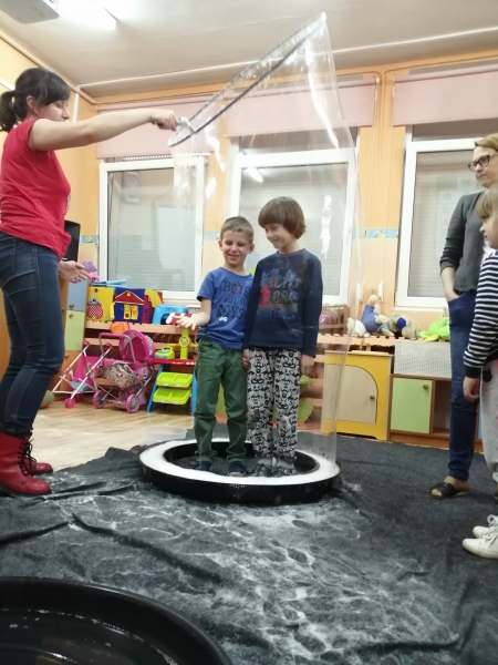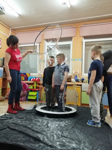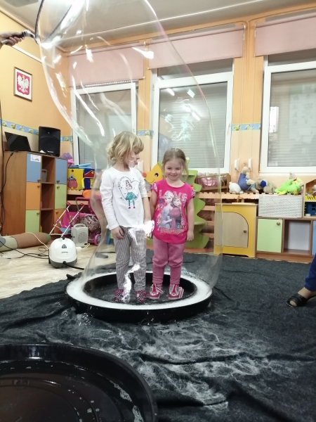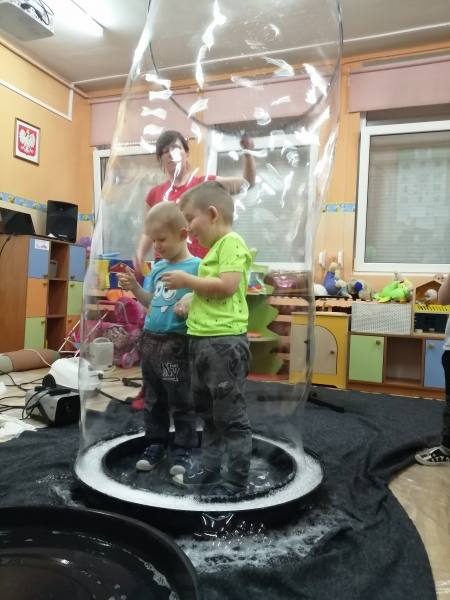 W marcu do naszego przedszkola przyjechali artyści i zaprosili nas do swojego magicznego świata baniek mydlanych. Pokaz bardzo się wszystkim podobał, dzieci podziwiały różne barwy i wielkości unoszących się dookoła baniek. Kulminacyjnym momentem było zamknięcie każdego przedszkolaka w bańce…to był wyjątkowy dzień.