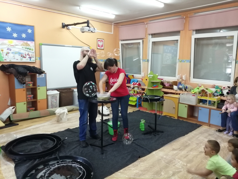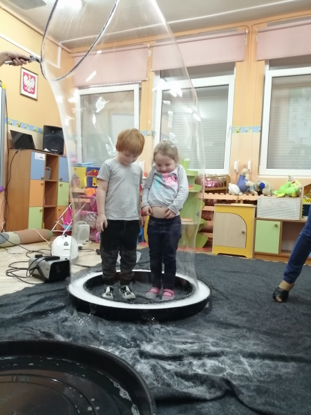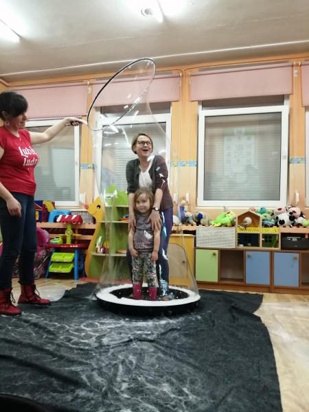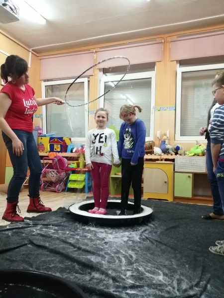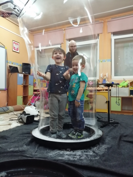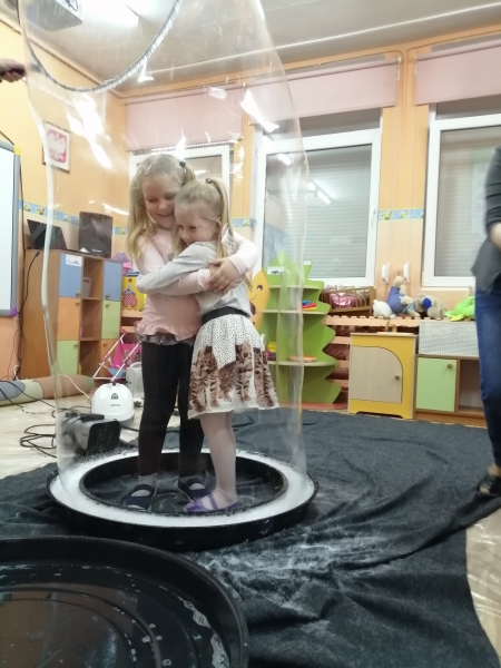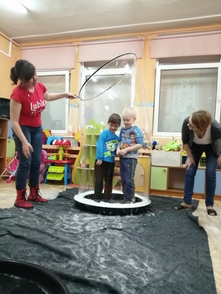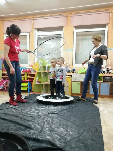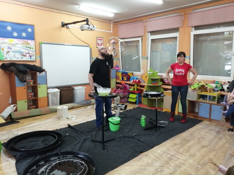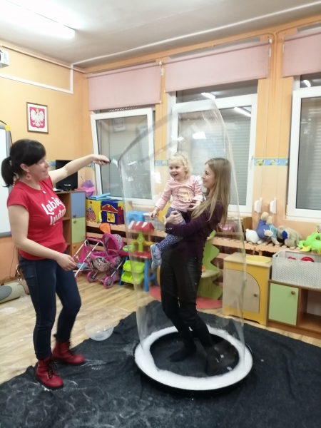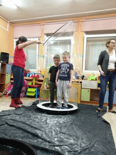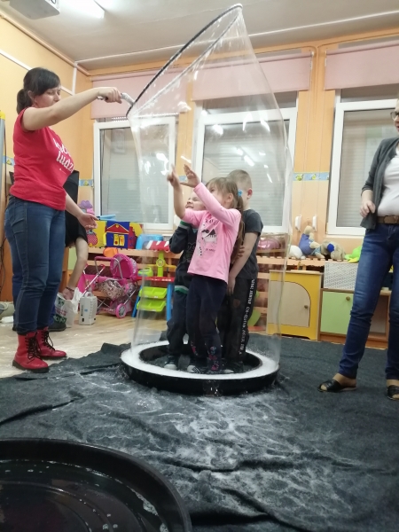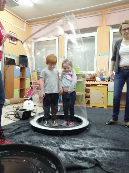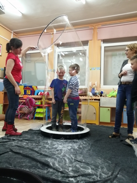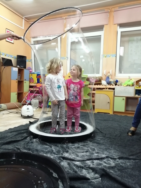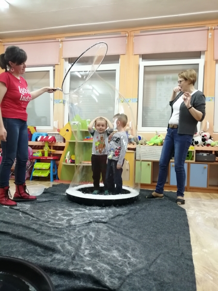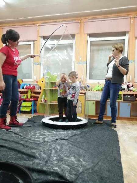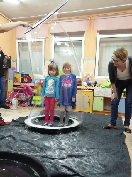 W marcu do naszego przedszkola przyjechali artyści i zaprosili nas do swojego magicznego świata baniek mydlanych. Pokaz bardzo się wszystkim podobał, dzieci podziwiały różne barwy i wielkości unoszących się dookoła baniek. Kulminacyjnym momentem było zamknięcie każdego przedszkolaka w bańce…to był wyjątkowy dzień.