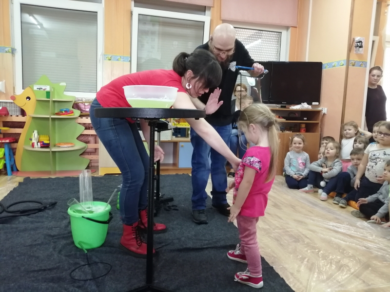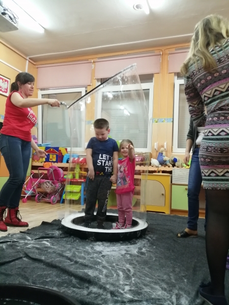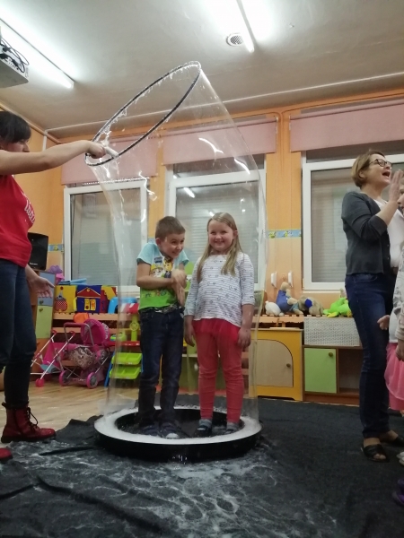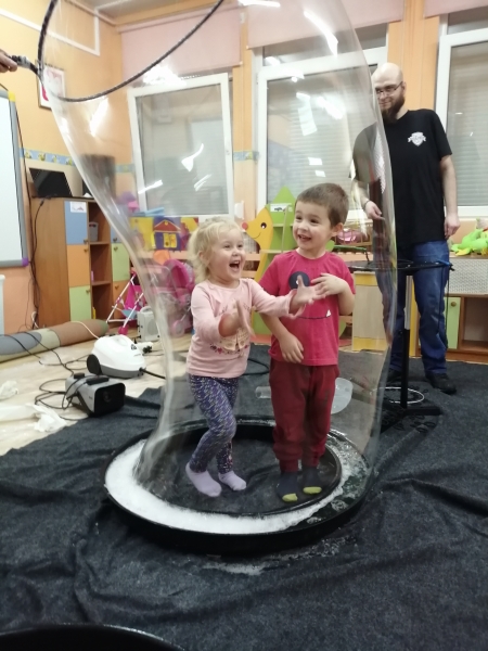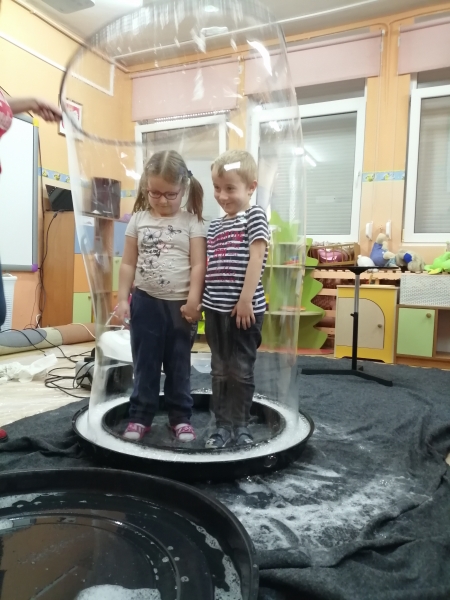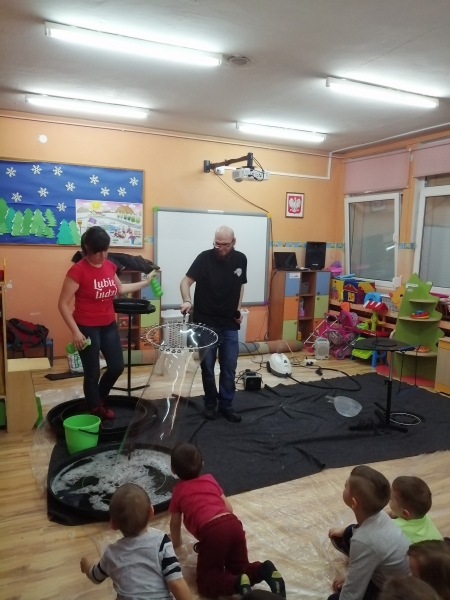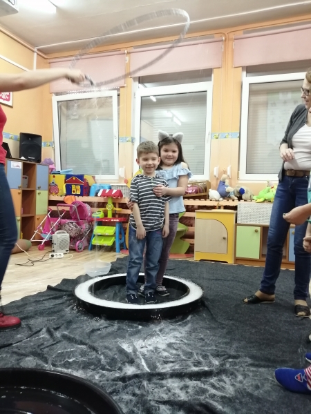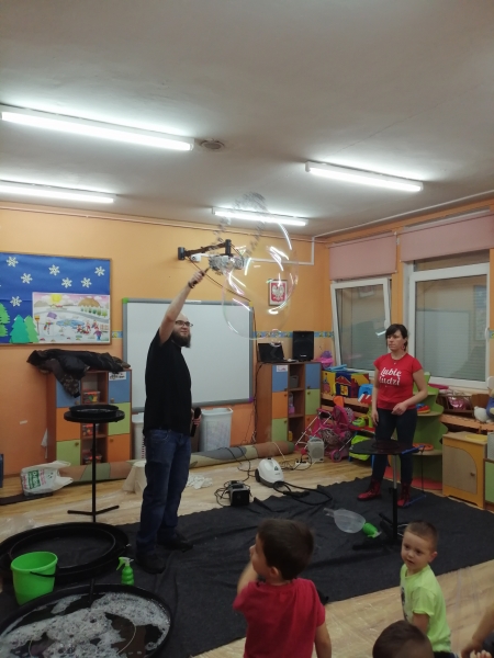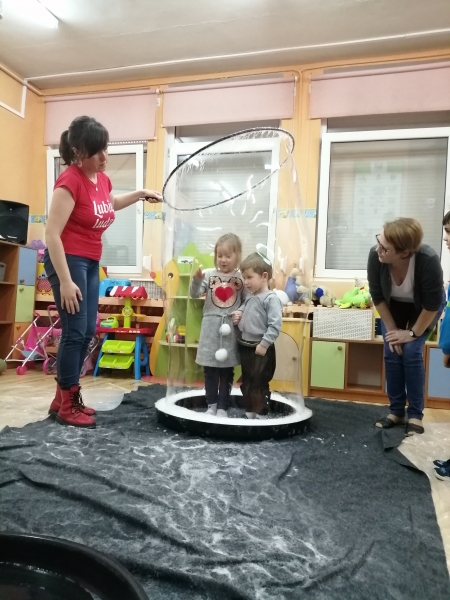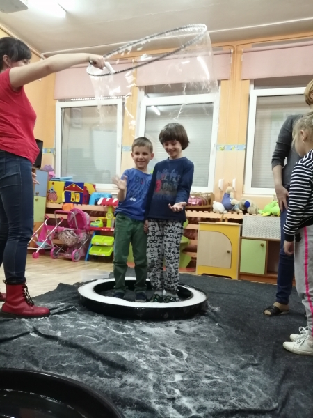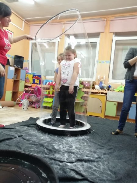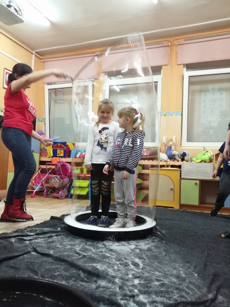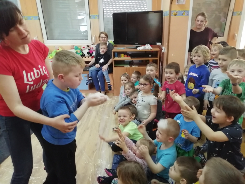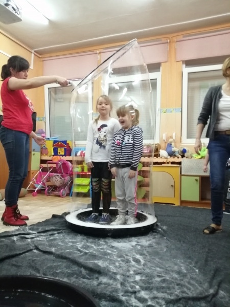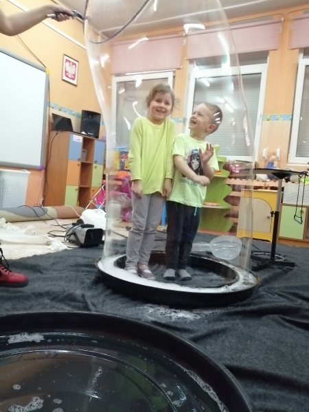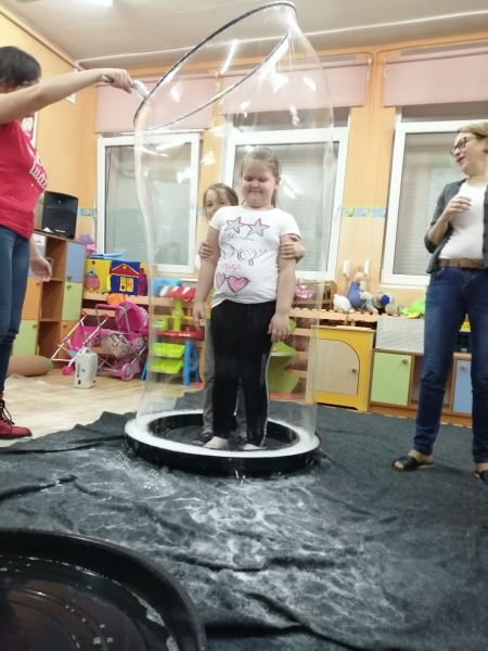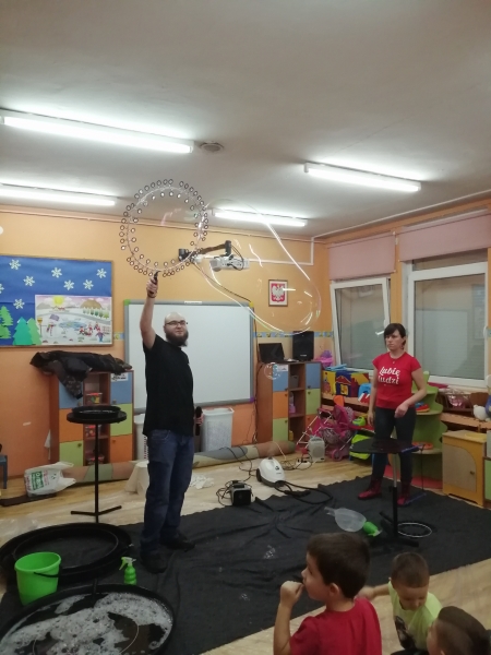 W marcu do naszego przedszkola przyjechali artyści i zaprosili nas do swojego magicznego świata baniek mydlanych. Pokaz bardzo się wszystkim podobał, dzieci podziwiały różne barwy i wielkości unoszących się dookoła baniek. Kulminacyjnym momentem było zamknięcie każdego przedszkolaka w bańce…to był wyjątkowy dzień.