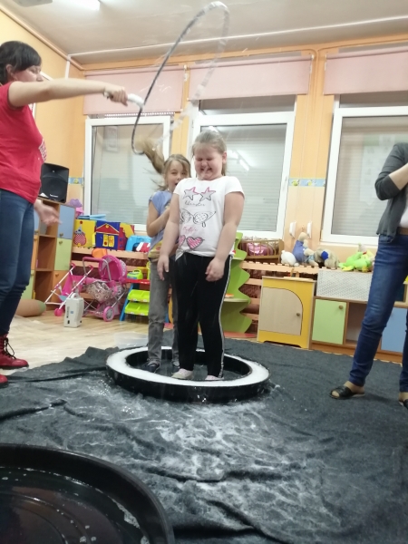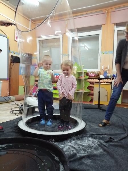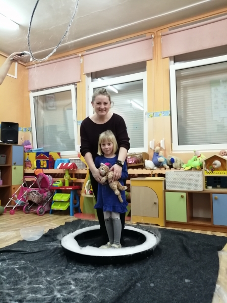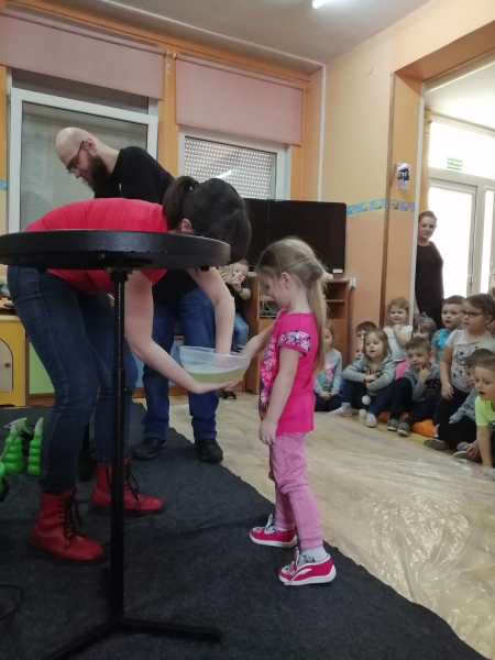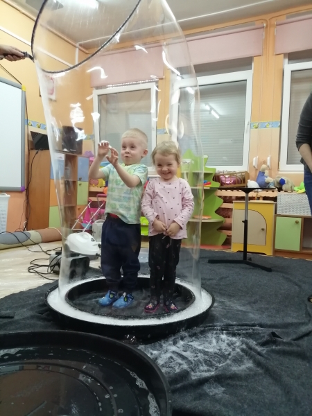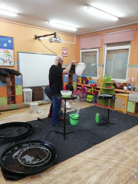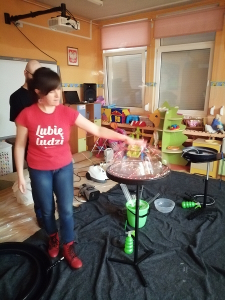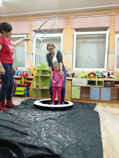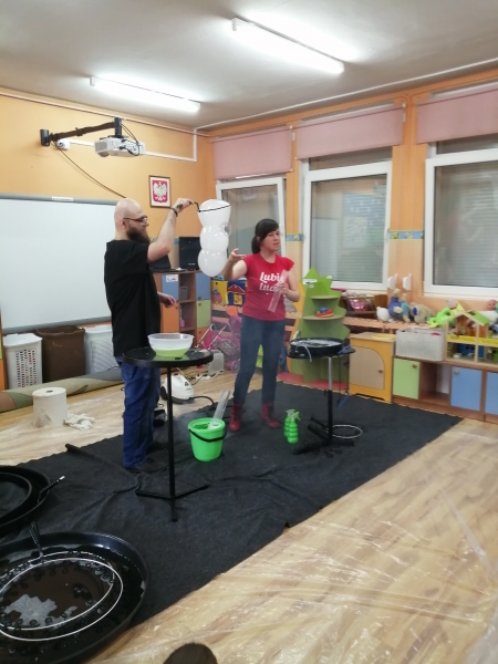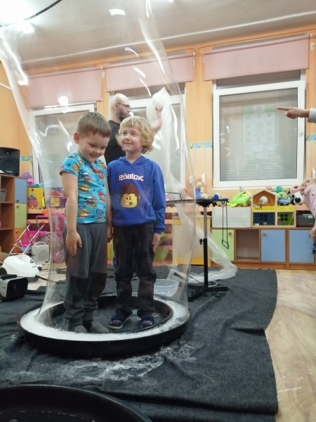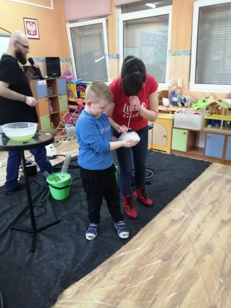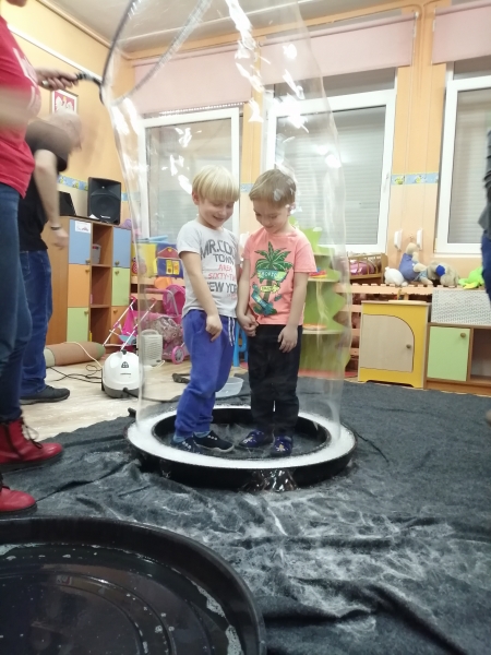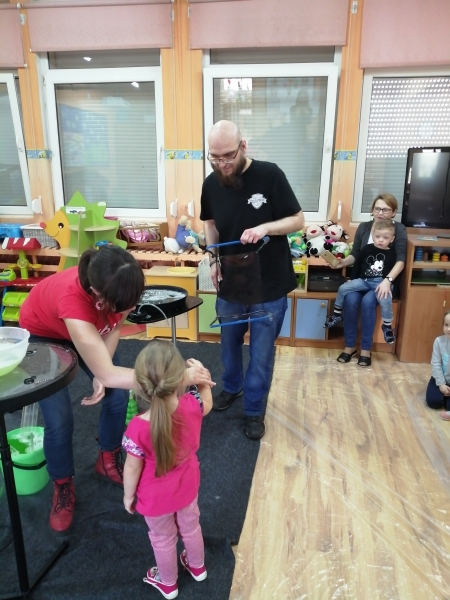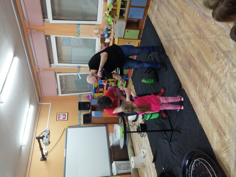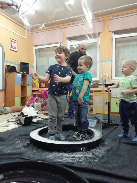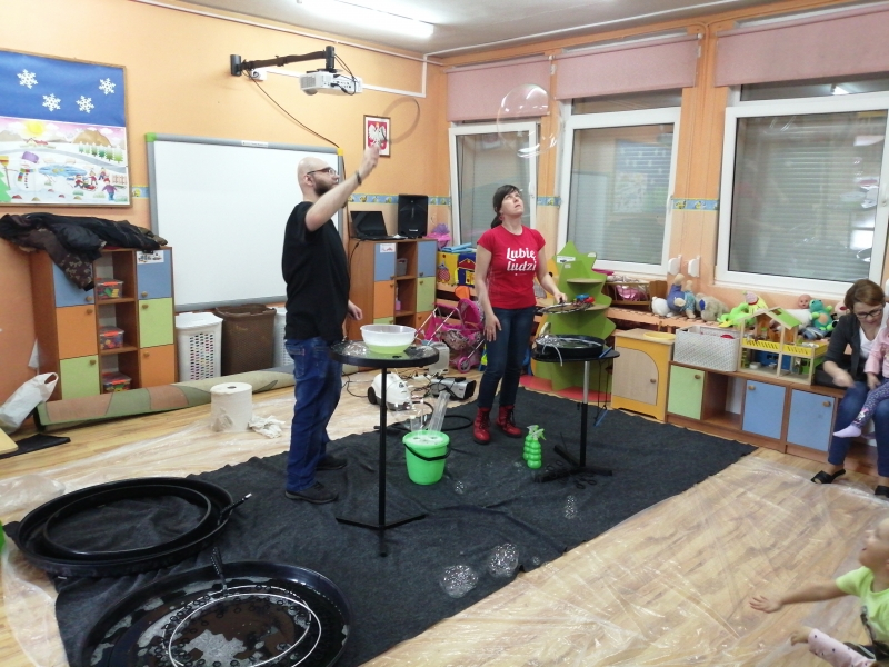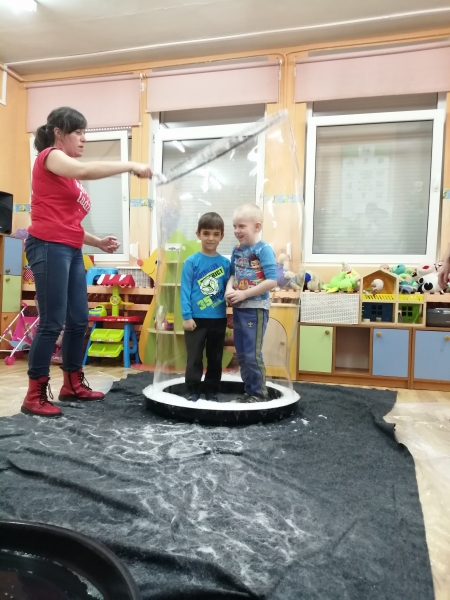 W marcu do naszego przedszkola przyjechali artyści i zaprosili nas do swojego magicznego świata baniek mydlanych. Pokaz bardzo się wszystkim podobał, dzieci podziwiały różne barwy i wielkości unoszących się dookoła baniek. Kulminacyjnym momentem było zamknięcie każdego przedszkolaka w bańce…to był wyjątkowy dzień.