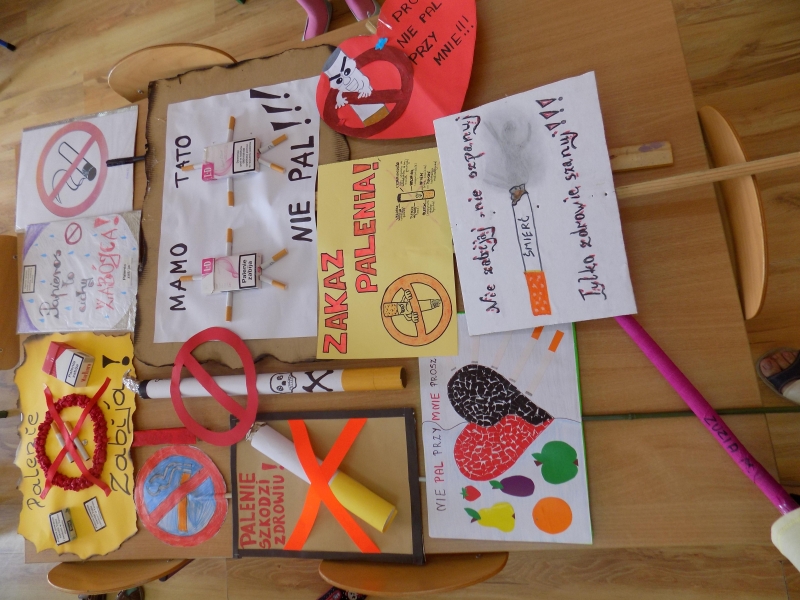 Dzieci wraz z rodzicami wykonały piękne transparenty, dzięki czemu każdy przedszkolak zaangażował się i rozmawiał ze swoimi rodzicami o szkodliwości palenia tytoniu. Każdy transparent był inny i widać było jak dużo pracy i zaangażowania rodzice i dzieci włożyli w tą akcję.