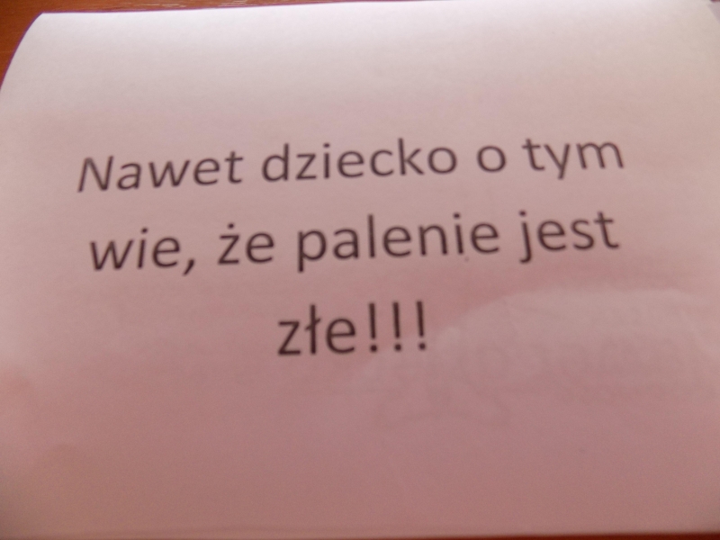 Dzieci obejrzały prezentację multimedialną o szkodliwości palenia. Dowiedziały się jak nikotyna szkodzi osobie uzależnionej, oraz o szkodliwości biernego palenia. Następnie dzieci przemaszerowały ulicami Skulska przekonując przechodniów, że palenie jest złe. Wielu przechodniów otrzymało przygotowane ulotki informacyjne. Dzieci otrzymały również ulotkę o szkodliwości tytoniu którą zabrały do domu dla swoich bliskich i kolorowankę.