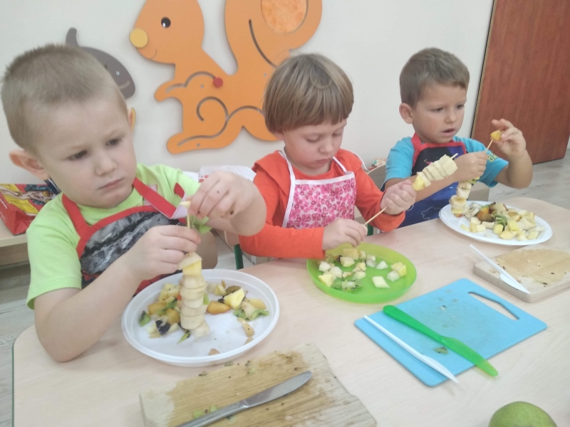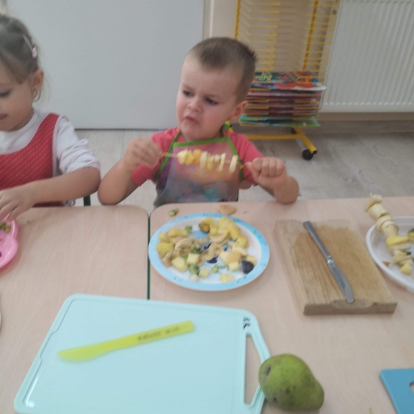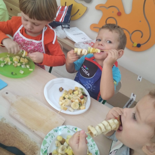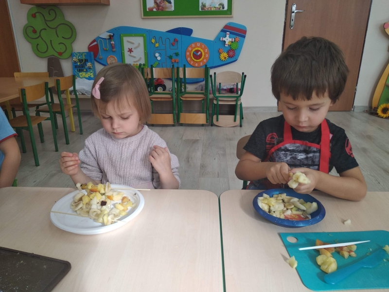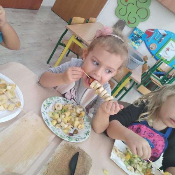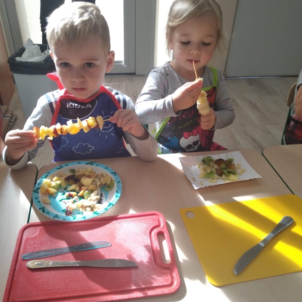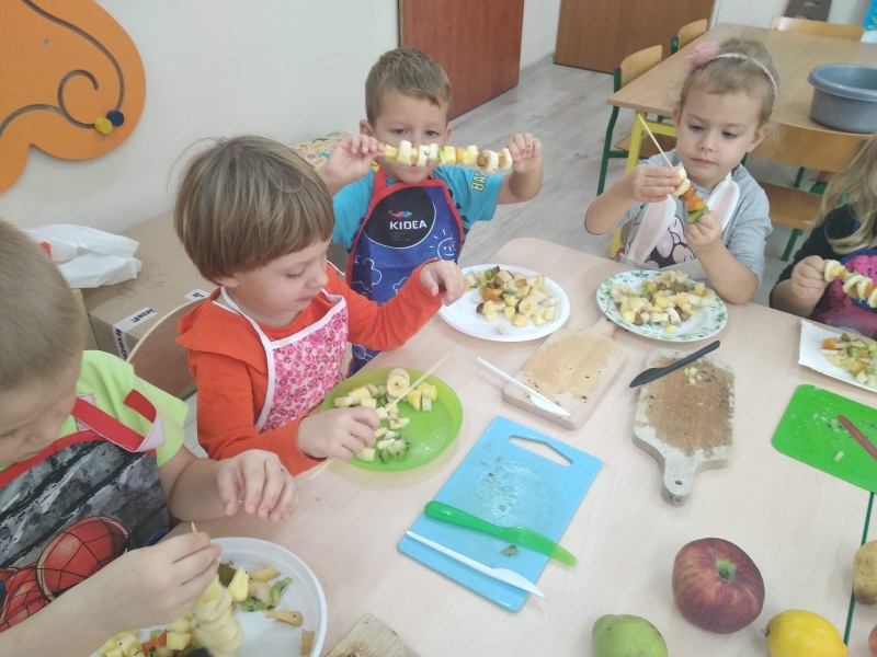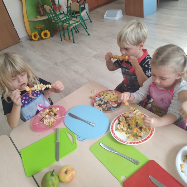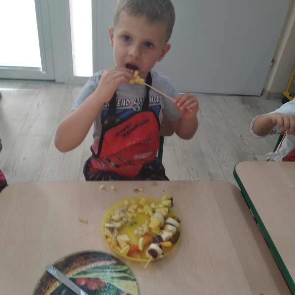 Dzieci z grupy Pszczółki bardzo lubią owoce. Z dużą radością i zaangażowaniem przygotowały więc samodzielnie owocowe szaszłyki. Kolorowe przekąski szybko znikały z talerzyków.