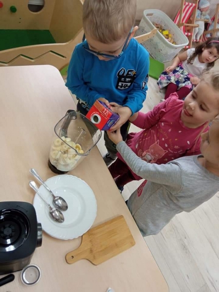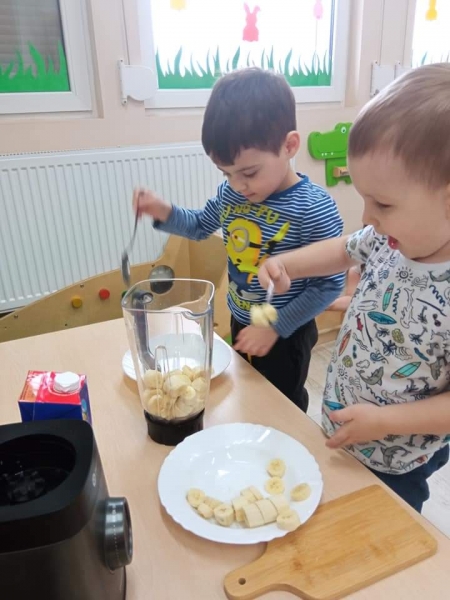 Przedszkolaki wspólnie przygotowały mleczno – bananowy koktajl, który z apetytem wypiły.