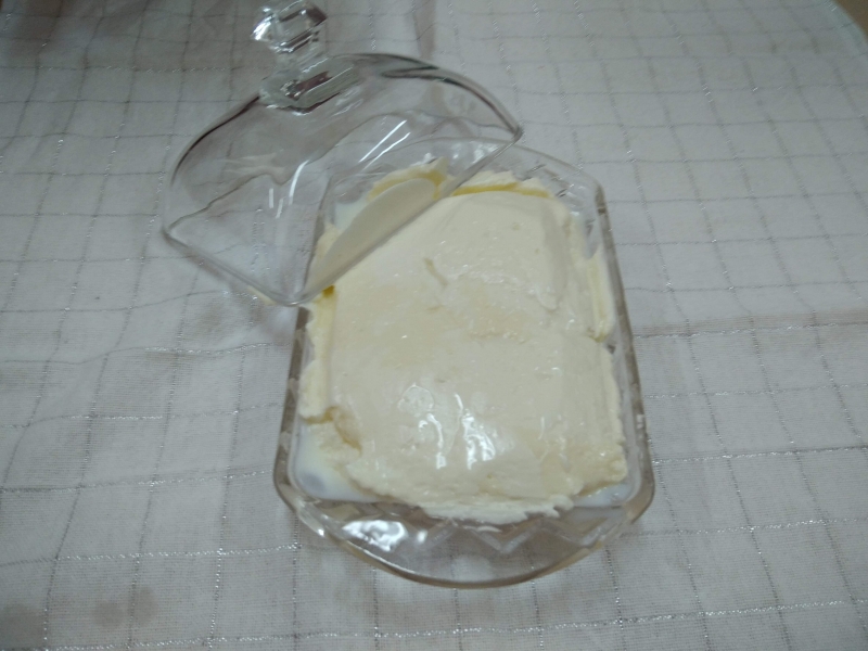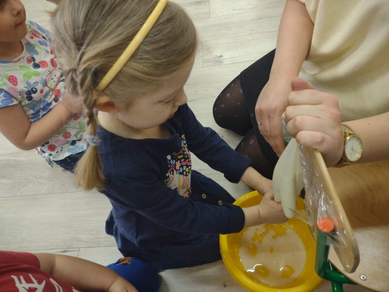 Poznały również proces produkcji masła w mleczarni oraz wiejskim gospodarstwie. Pracą mięśni całej grupy udało się ubić pyszne, domowe masełko. Mniam…