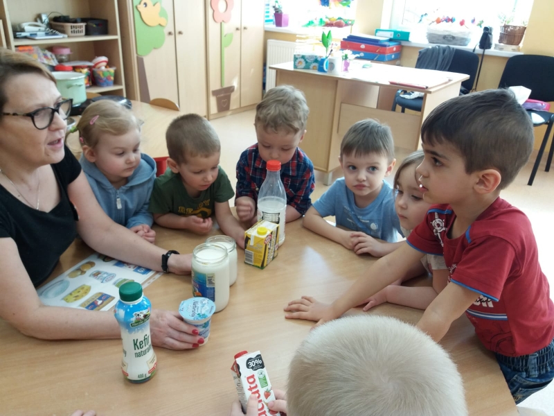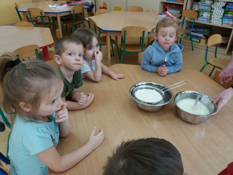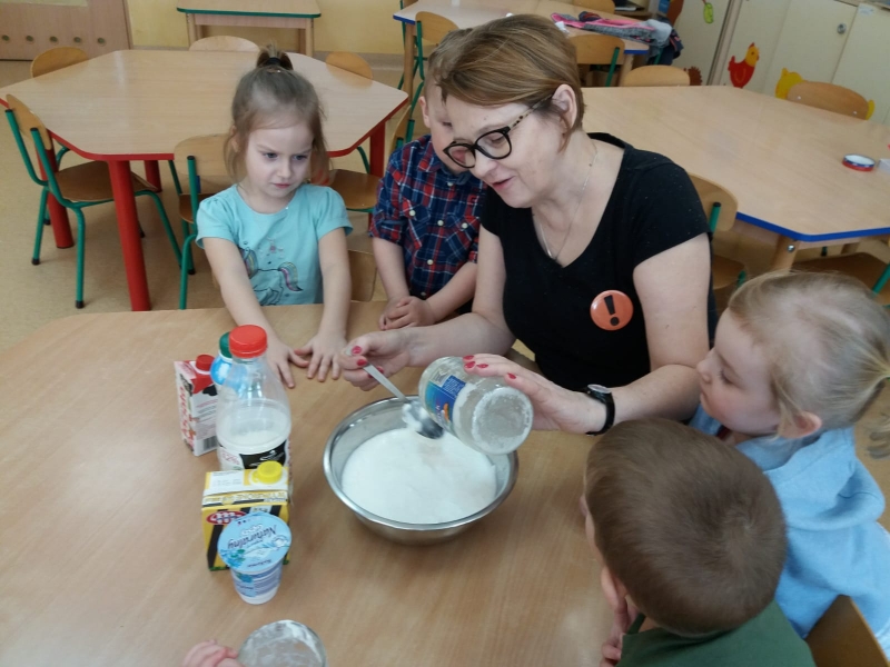 Sami  „Robimy Ser” o,  to sprawa robi się ciekawa. Wspólne działanie na zajęciach rozwija naszą ciekawość, wzbogaca wiedzę, a przede wszystkim pobudza nasze zmysły. Zdobycie „siadłego”  krowiego mleka nie jest łatwą sprawą, jeszcze tylko świeże mleko, śmietanka, no i trochę pracy. Wato było serek wyszedł przepyszny i co najważniejsze wszystkie dzieci przyłączyły się do degustacji.