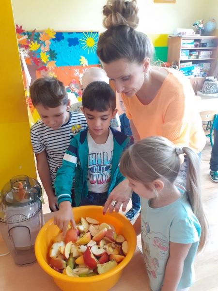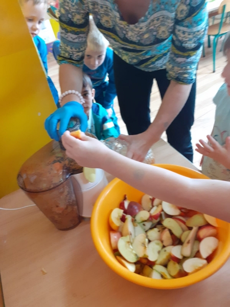 Sok owocowy. utworzone przez PRZEDSZKOLE SKULSK | paź 6, 2019 | 2019/2020, Promocja zdrowia i profilaktyka. Jesień to pora roku obfitująca w pyszne i zdrowe owoce i warzywa. Przedszkolaki z grupy Motylki wraz z wychowawcą przygotowały samodzielnie sok, który bardzo wszystkim smakował. Na zdrowie!